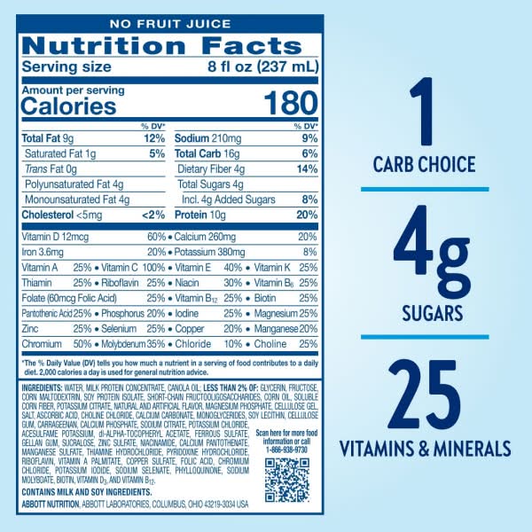 Ingredients: Water, Milk Protein Concentrate, Canola Oil, Less than 2% of: Glycerin, Fructose, Corn Maltodextrin, Soy Protein Isolate, Short-chain Fructooligosaccharides, Corn Oil, Soluble Corn Fiber, Potassium Citrate, Natural and Artificial Flavor, Magnesium Phosphate, Cellulose Gel, Salt, Ascorbic Acid, Choline Chloride, Calcium Carbonate, Monoglycerides, Soy Lecithin, Cellulose Gum, Carrageenan, Calcium Phosphate, Sodium Citrate, Potassium Chloride, Acesulfame Potassium, dl-Alpha-Tocopheryl Acetate, Ferrous Sulfate, Gellan Gum, Sucralose, Zinc Sulfate, Niacinamide, Calcium Pantothenate, Manganese Sulfate, Thiamine Hydrochloride, Pyridoxine Hydrochloride, Riboflavin, Vitamin A Palmitate, Copper Sulfate, Folic Acid, Chromium Chloride, Potassium Iodide, Sodium Selenate, Phylloquinone, Sodium Molybdate, Biotin, Vitamin D3, Vitamin B12 Contains: Milk, Soybeans, Corn