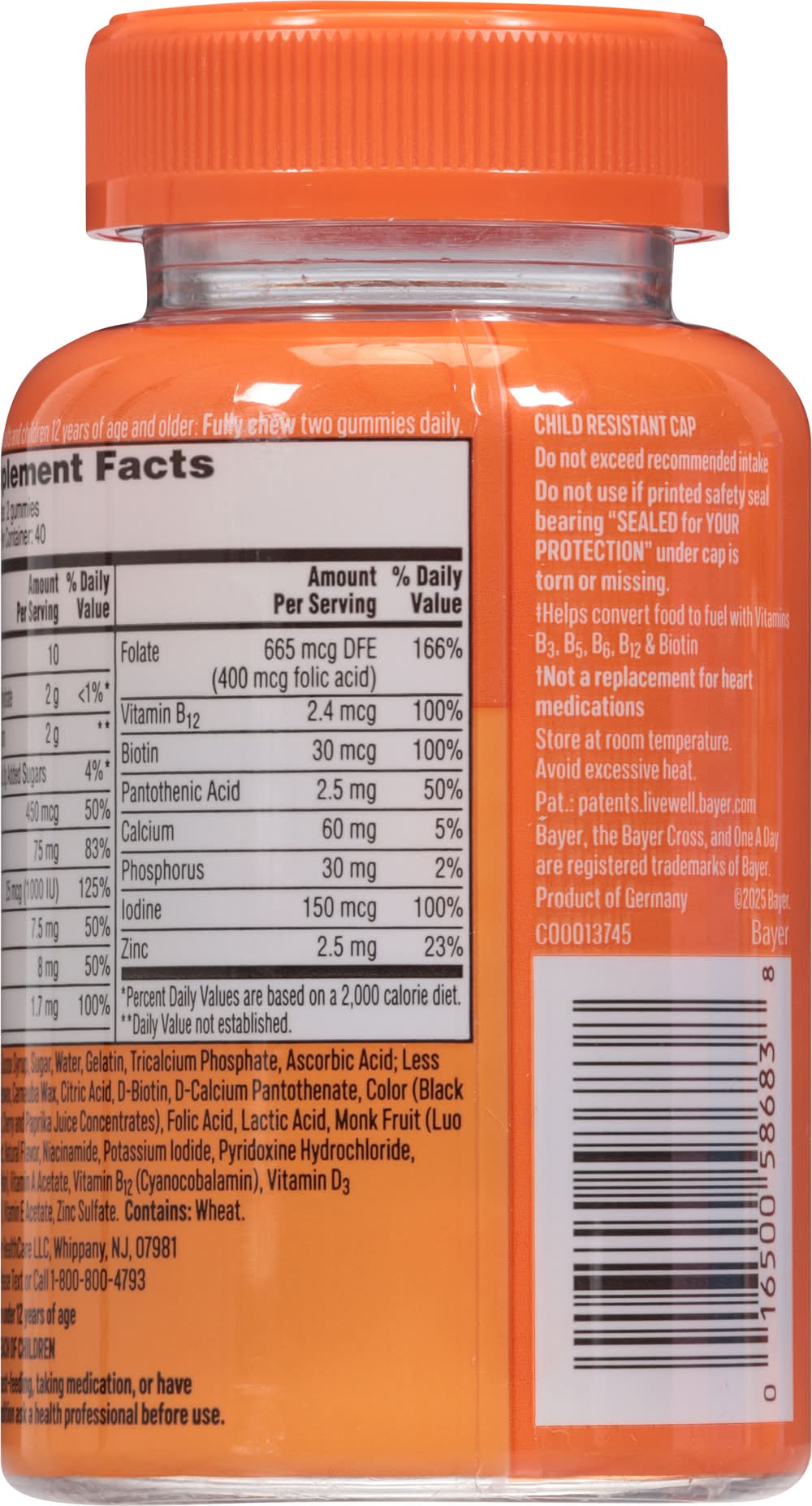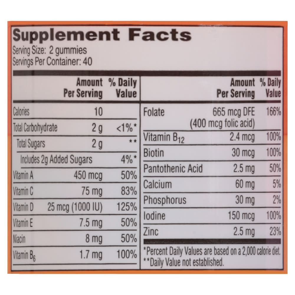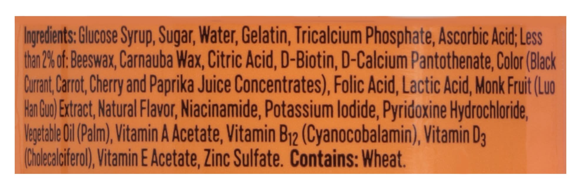 Ingredients: Glucose Syrup, Sugar, Water, Gelatin, Tricalcium Phosphate, Ascorbic Acid; Less than 2% of: Beeswax, Carnauba Wax, Citric Acid, D-Biotin, D-Calcium Pantothenate, Color (Black Currant, Carrot, Cherry and Paprika Juice Concentrates), Folic Acid, Lactic Acid, Monk Fruit (Luo Han Guo) Extract, Natural Flavor, Niacinamide, Potassium Iodide, Pyridoxine Hydrochloride, Vegetable Oil (Palm), Vitamin A Acetate, Vitamin B12 (Cyanocobalamin), Vitamin D3 (Cholecalciferol), Vitamin E Acetate, Zinc Sulfate Contains: Wheat