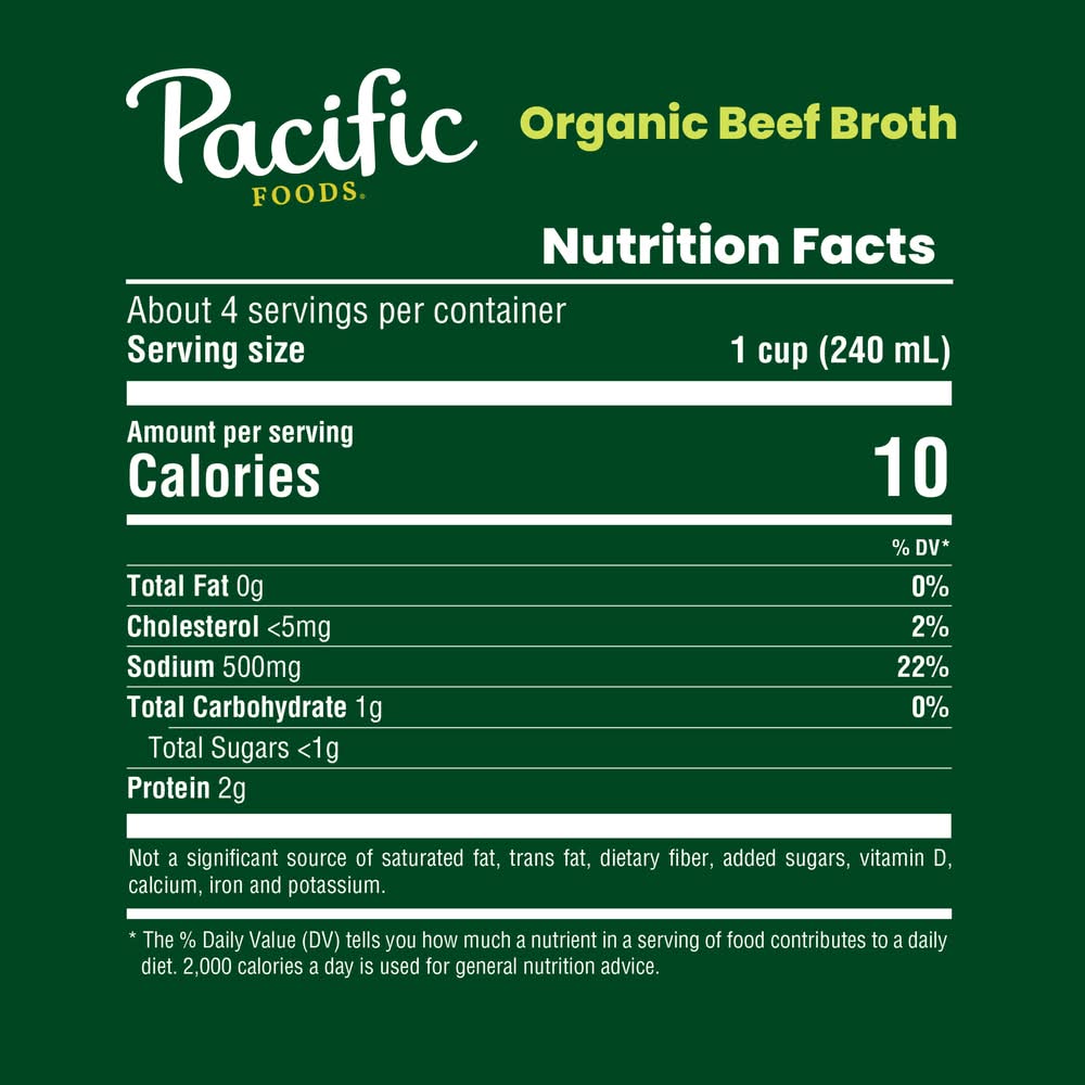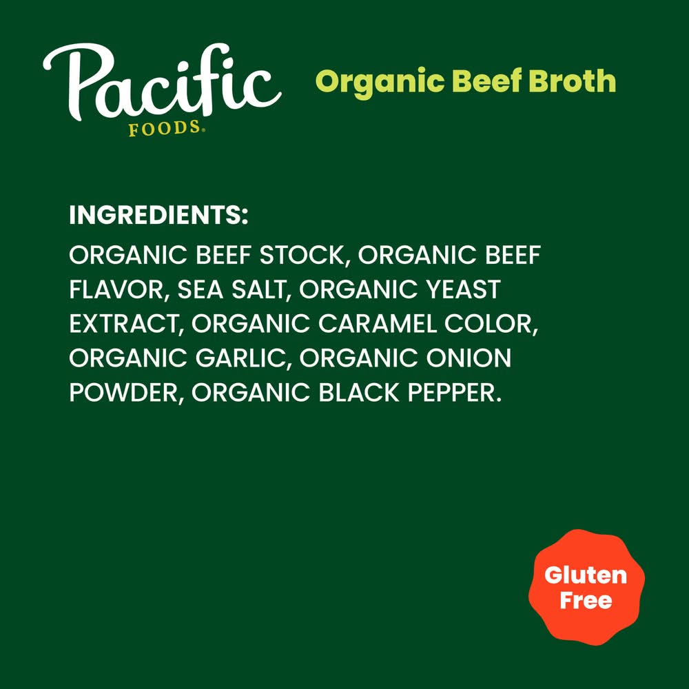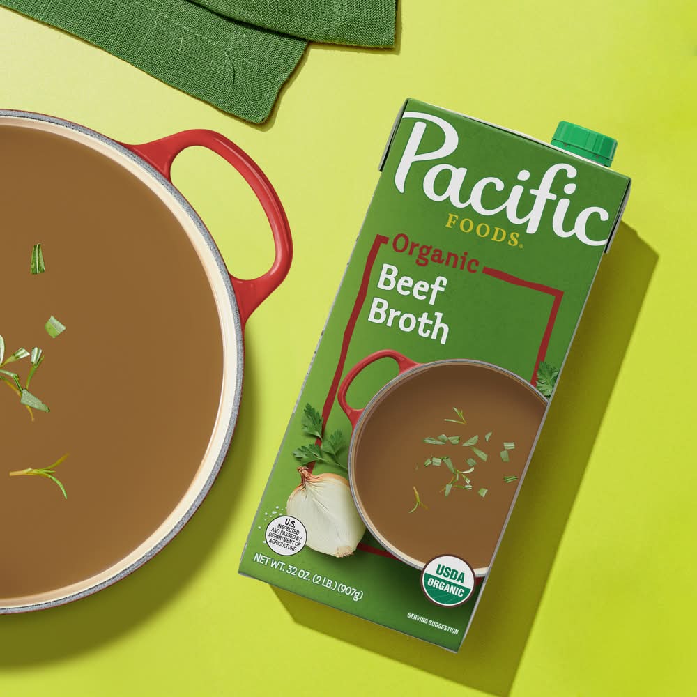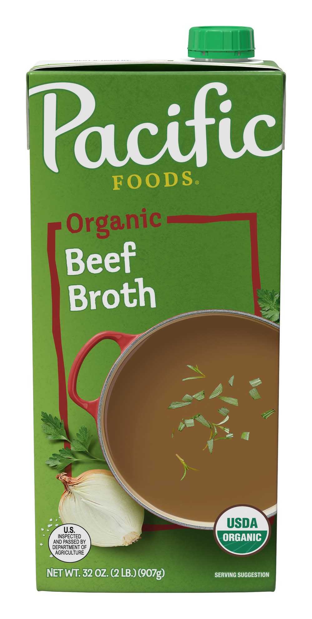 Effortlessly craft extraordinary meals with Pacific Foods Organic Beef Broth. We slow-simmer humanely raised organic beef with onions, garlic and a touch of sea salt for a savory beef broth that’s rich and full of flavor. Easier to prepare than beef bouillon, this broth is a delectably simple and nuanced canvas for your favorite dishes. Use it in any recipe that calls for beef broth, beef stock or water. It’s great as a soup base and for crafting delectable stews and ramen. It also elevates gravies, sauces and marinades, and it enhances the cooking of grains, protein and veggies. Each 32 oz recyclable carton contains approximately 4 servings of our gluten free and USDA Certified Organic broth. In addition to using it for cooking, you can enjoy this savory beef broth on its own as a simple yet flavorful beef soup. Customize it with your favorite toppings, or pair it with a sandwich, salad or wrap. In addition to beef broth, Pacific Foods also offers chicken broth, turkey broth, vegetable broth and more. At Pacific Foods, we're dedicated to making the most nourishing foods possible from simple, carefully sourced ingredients. • Flavor: Beef • Pacific Foods of Oregon LLC, Tualatin,OR,97062 • Packaging: Reusable