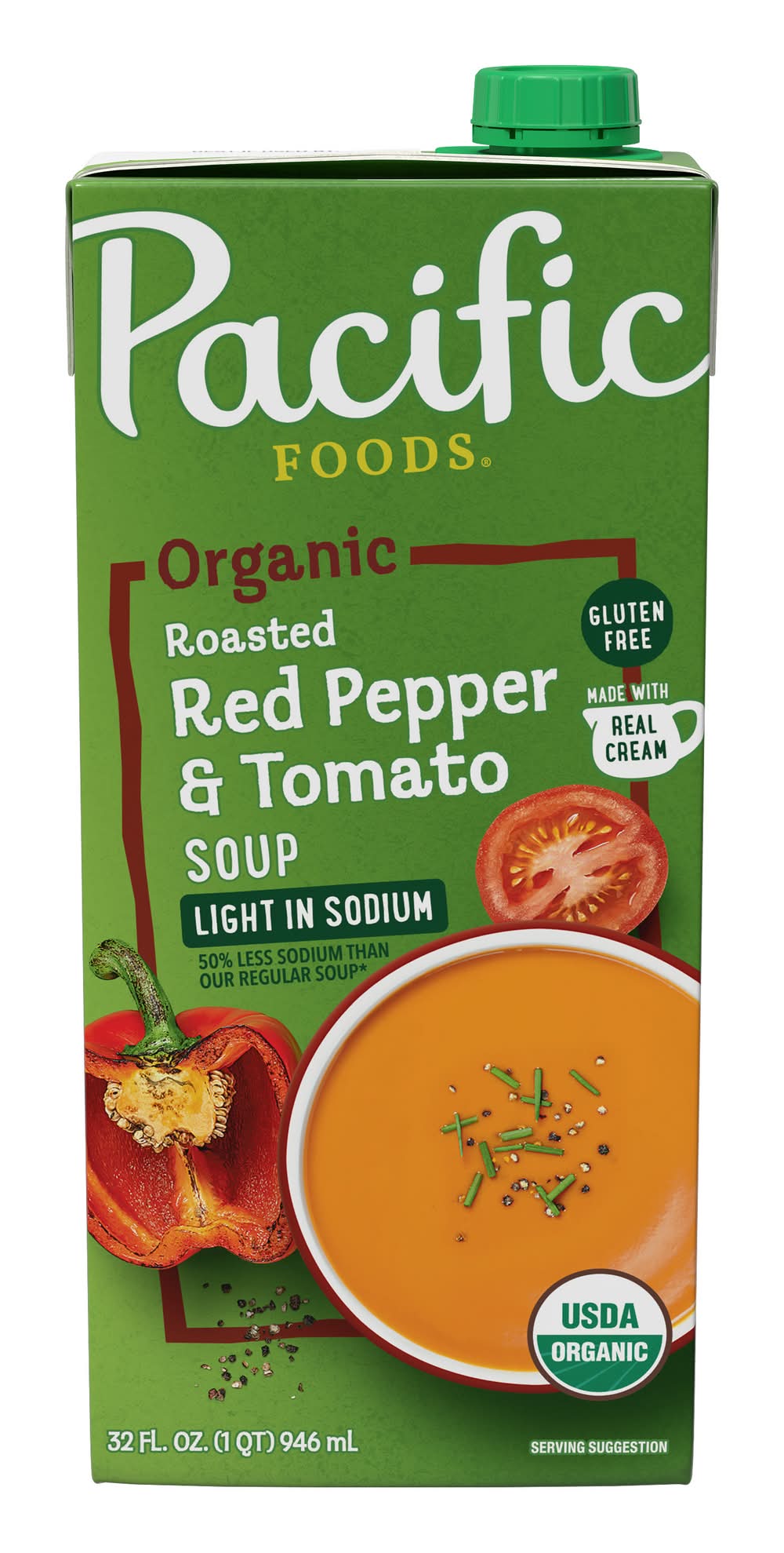 Immerse your taste buds into something truly unique with Pacific Foods Light in Sodium Organic Roasted Red Pepper and Tomato Soup. Smooth and subtly sweet, this USDA Organic soup is consciously crafted with non-GMO ingredients, including vine-ripened tomatoes, real cream, and 50% less sodium* than the regular version. Roasted red bell peppers add a hint of smoky sweetness, creating a flavorful vegetarian soup that satisfies with every spoonful. Providing 1 cup of vegetables per serving, this gluten free soup makes it easy to be intentional about the way you stock your pantry. Enjoy it on its own as a quick and easy vegetarian snack, customize it with your favorite toppings, or pair it with a salad, sandwich, or wrap. You can also use it to create flavorful sauces or as a base for your favorite side dish. Each 32 oz resealable carton contains about 4 servings of organic tomato soup. To prepare, simply pour, heat until hot, stir, and enjoy. In addition to Roasted Red Pepper and Tomato, Pacific Foods offers Creamy Tomato, Tomato Basil, and more. At Pacific Foods, we’re dedicated to making the most nourishing foods possible from simple, carefully sourced ingredients. (*Contains 310mg of sodium compared to 650mg in regular Pacific Organic Roasted Red Pepper and Tomato Soup) • Flavor: Roasted red pepper and tomato • Number of servings: 4 • Pacific Foods of Oregon, LLC, Tualatin, OR , 97062 , Ph: 503-783-6533 • Packaging: Reusable