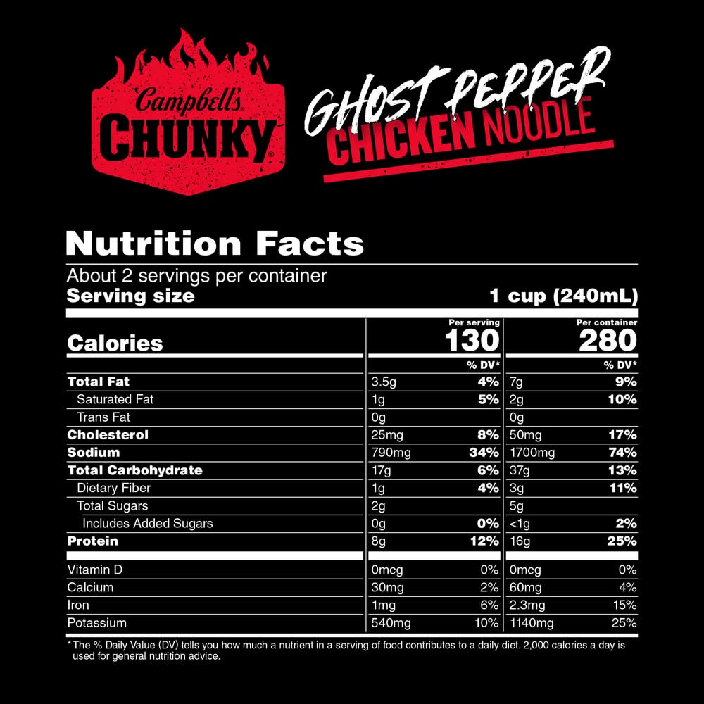 Turn up the heat on your hunger with Campbell’s Chunky Ghost Pepper Chicken Noodle Soup. This chunky chicken soup features big pieces of white chicken meat with no antibiotics plus red peppers, carrots, celery and enriched egg noodles, all in a sizzling broth seasoned with ghost pepper and chili pepper extracts. With 16g of protein per can, it’s a satisfyingly spicy soup that fuels even the heartiest of appetites. Campbell’s Chunky Soup is a year-round pantry staple and the MVP of game day snacks, delivering a winning combination of flavor and convenience. Enjoy a warm bowl of this canned soup when watching the game from home, or use it as an ingredient in dips, casseroles and other tailgating recipes. To prepare the microwave soup, simply pour into a microwave-safe bowl and heat — do not add water. Or heat in a saucepan on the stove, stirring occasionally. Whether you’re a football fan or simply craving something hearty, Campbell’s Chunky Ghost Pepper Chicken Noodle Soup will keep you feeling full and satisfied from kickoff to the final whistle. Make every game day a winner with Campbell's Chunky – Soup That Eats Like a Meal. Flavor: Ghost pepper