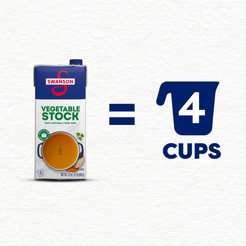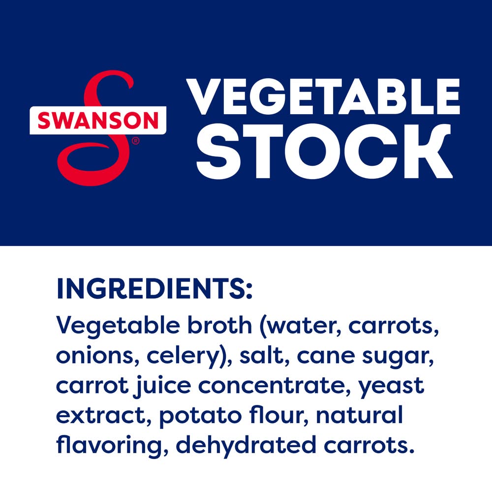 Elevate your homemade meals with the rich, full-bodied flavor of Swanson Vegetable Stock. Swanson vegetable stock brings together the perfectly balanced flavors of farm-grown, vegetables picked at the peak of freshness and simple seasonings in a convenient recyclable carton. And just like homemade, our stock uses only 100% natural, non-GMO ingredients, no artificial flavors or colors, and no preservatives. More convenient than vegetable bouillon, this gluten free veggie stock is a versatile ingredient for your everyday cooking, adding flavor and moisture to both entrees and side dishes. Vegetable stock has an even richer flavor and a heavier texture than vegetable broth, with simple seasonings so you can adjust your finished dish to taste. It’s great as a vegetarian soup base, and it can be used instead of water to boost rich flavor in rice, pasta and veggies. Swanson Vegetable Stock is a must-have-for your holiday cooking, bringing richer, elevated homemade flavor to mashed potatoes, stuffing and more. It’s not just any broth. It’s not just any stock. It’s Swanson. • Campbell Soup Company, Camden,NJ,08103-1701,U.S.A. • Packaging: Reusable