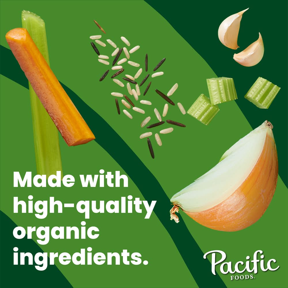 Immerse your taste buds into something truly unique with Pacific Foods Organic Lightly Salted* Chicken and Wild Rice Soup. This organic soup has tender organic chicken, wild and brown rice and a variety of organically grown vegetables. Parsley and other seasonings round out the flavor of this gluten free soup, bringing a classic recipe to a whole new level of goodness. Enjoy this chicken and rice soup on its own as a quick and easy snack, customize it with your favorite toppings or pair this soup with a salad, sandwich or wrap. USDA Certified Organic and made with non-GMO ingredients, this organic chicken soup contains 12 grams of protein per can and is made with no MSG, high fructose corn syrup, artificial colors or artificial flavors. To prepare, simply pour it into a saucepan or microwave-safe bowl, heat until hot, stir and enjoy. Every spoonful of our microwave soup is satisfying to the last drop. The soup can is recyclable for easy disposal. *50% less sodium than our regular soup In addition to our Chicken and Wild Rice, we offer Chicken Noodle, Vegetable Lentil and more. At Pacific Foods, we're dedicated to making the most nourishing foods possible from simple, carefully sourced ingredients. Flavor: Chicken-wild rice