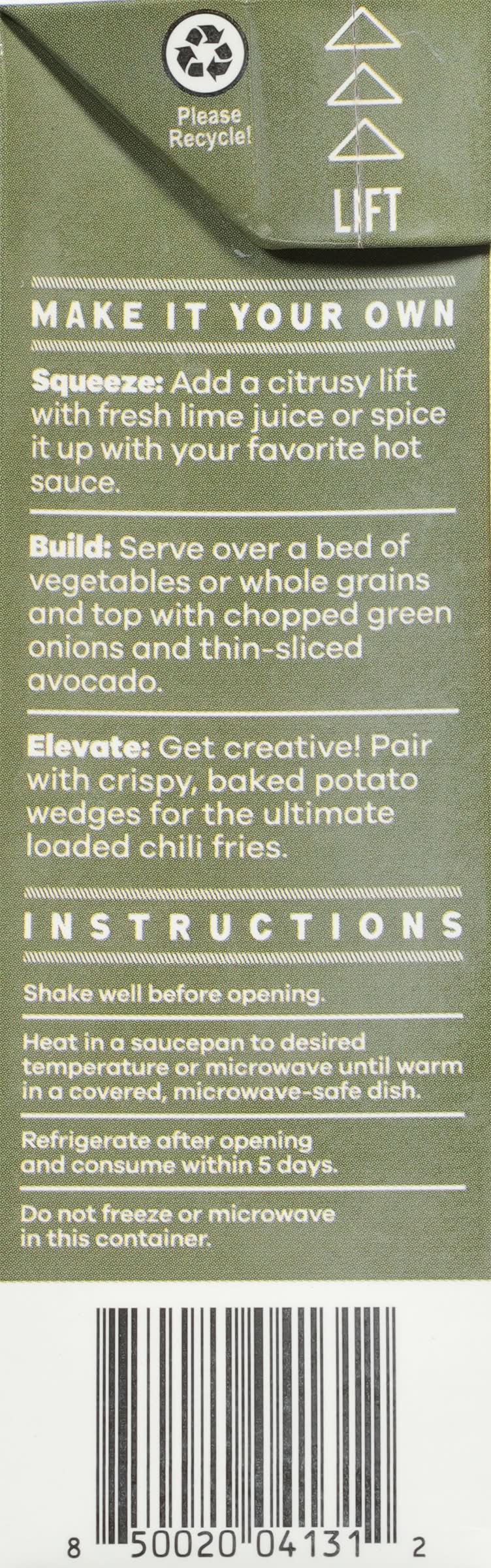 Directions for use: Usage of instructions:Instructions: Shake well before opening. Do not freeze or microwave in this container. - Directions: Instructions: Shake well before opening. Do not freeze or microwave in this container. Make It Your Own: Squeeze: Add a citrusy lift with fresh lime juice or some extra heat with your favorite hot sauce. Build: Serve over a bed of vegetables and top with chopped green onions or thin-sliced avocado. Elevate: Get creative! Pair with crispy, baked potato wedges for the ultimate loaded chili fries. Refrigerate after opening and consume within 5 days. Storage recommendation: Refrigerate after opening and consume within 5 days.
