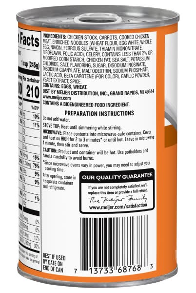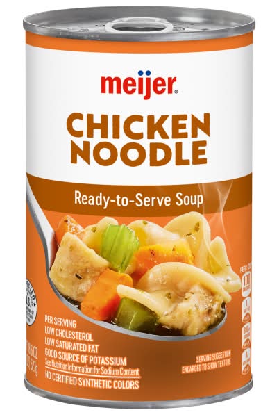 Meijer Chicken Noodle Soup is a ready-to-serve comfort food, packed with a hearty blend of chicken stock, noodles, carrots, celery, and cooked white chicken meat. This hearty soup is perfect for a quick, warm and savory meal.