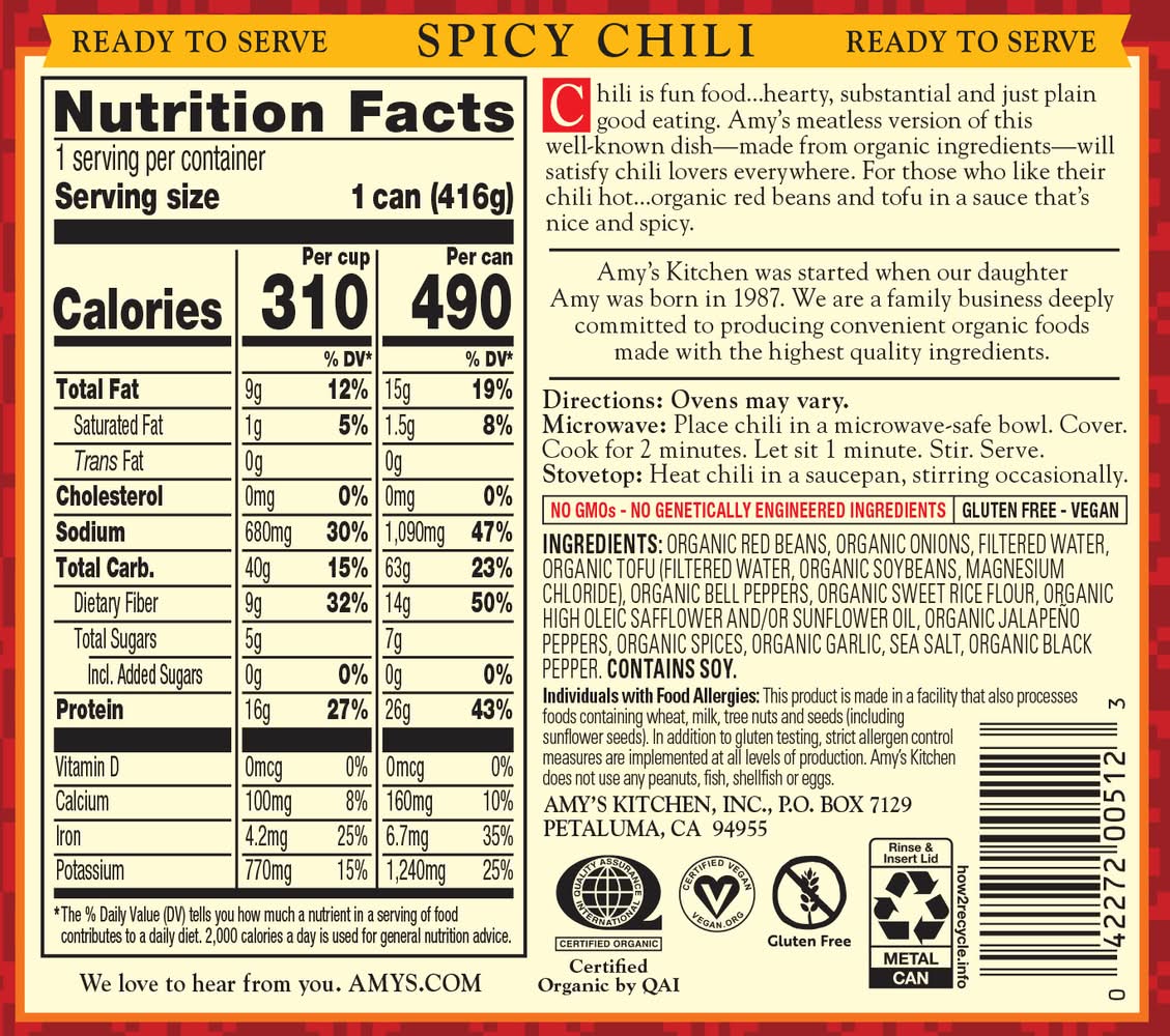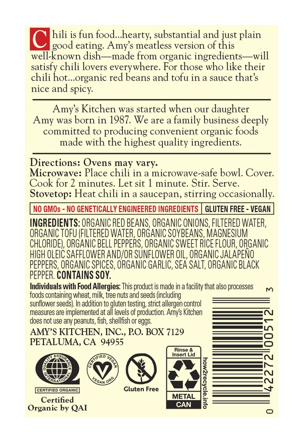 Spicy Chili • Amy's Kitchen, Inc., PO Box 7129,Petaluma,CA,94954 • Packaging: Reusable