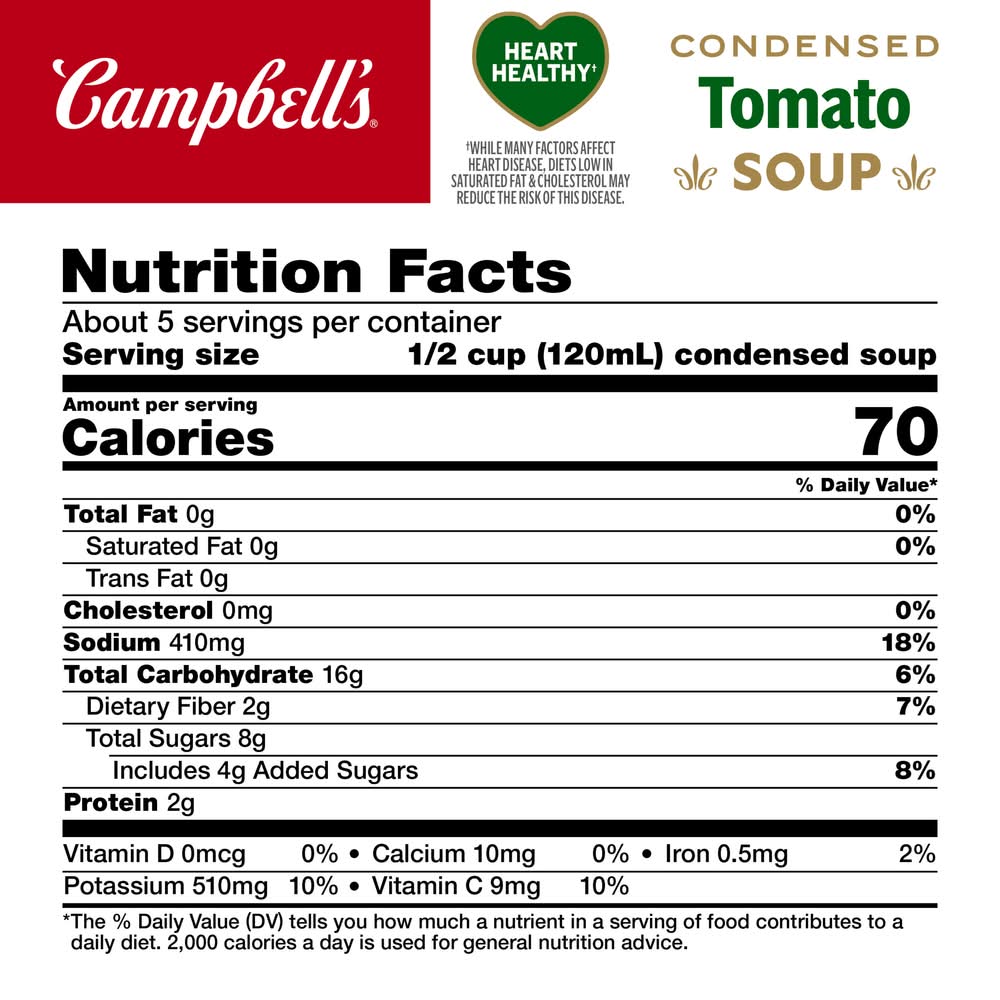 It is crafted to support a heart-healthy diet by being low in saturated fat and cholesterol, which may help reduce the risk of heart disease. • Number of servings: 5 • Campbell Soup Company, Camden, NJ, • Packaging: Reusable