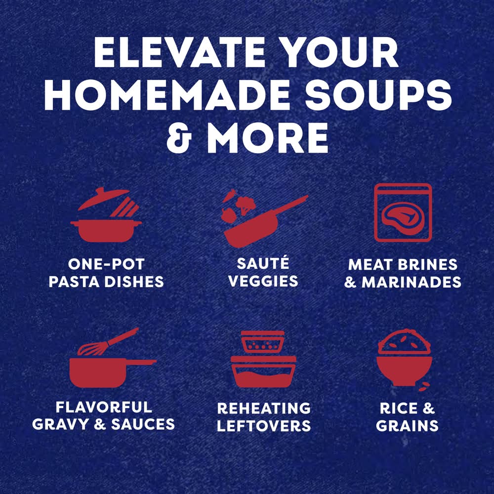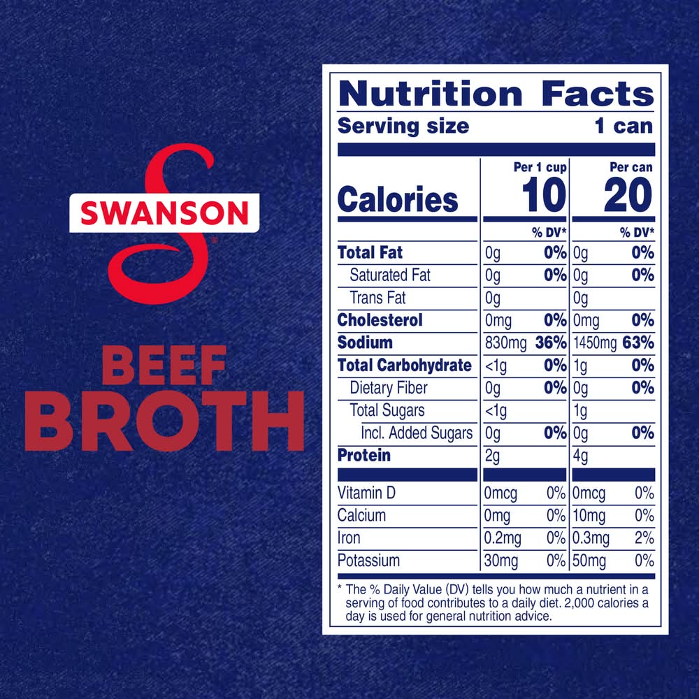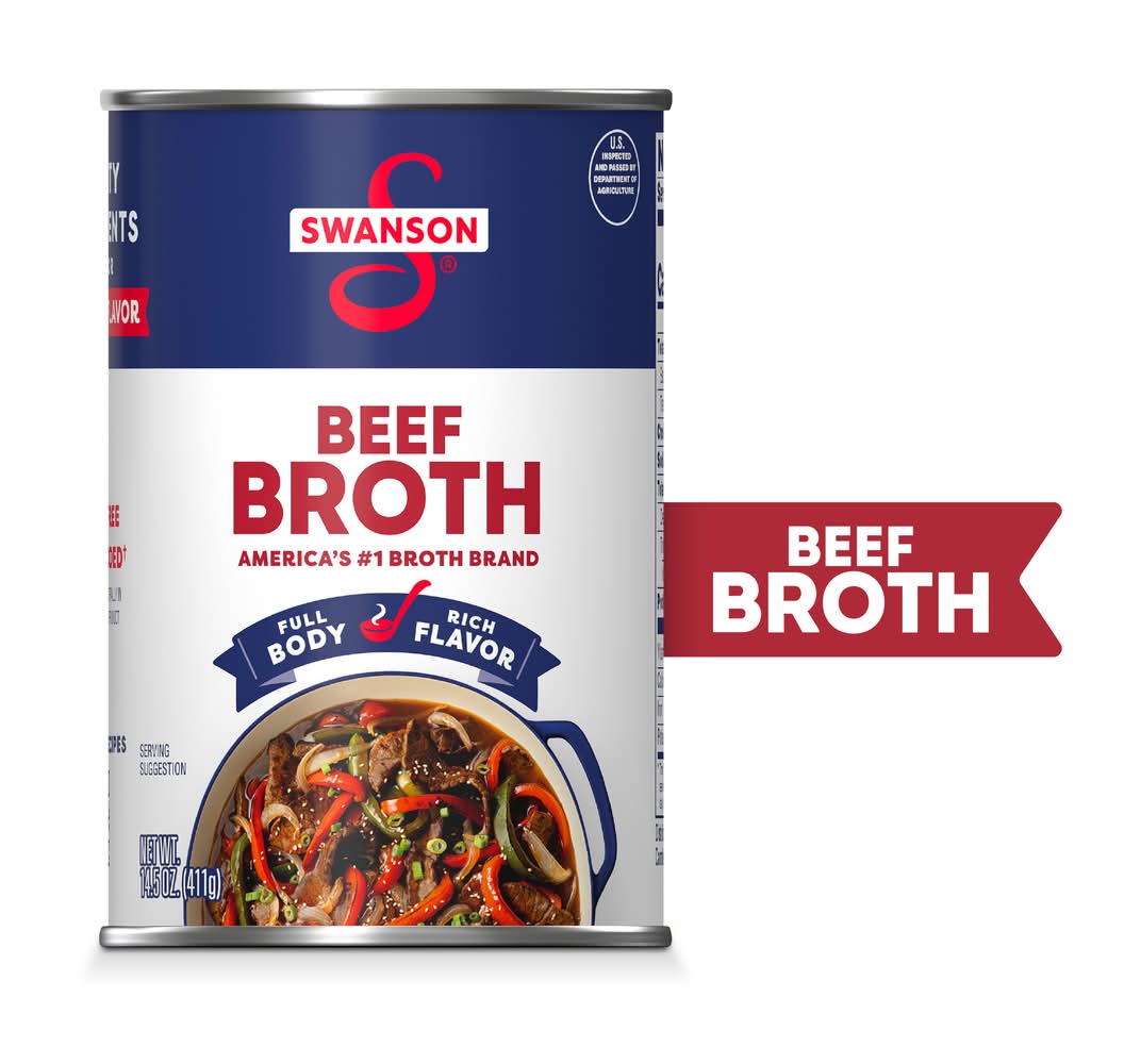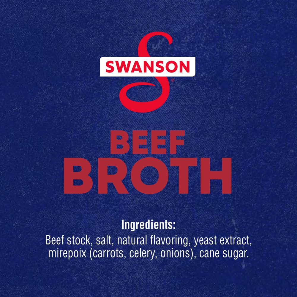 Swanson Beef Broth is the foundation of full-bodied, rich flavor that turns good homemade meals into unforgettable ones. Whether you're simmering a hearty stew, creating a flavorful sauce, or cooking up savory one-pot dishes, Swanson Beef Broth is your go-to for elevating everyday meals. Swanson Beef Broth is made without added MSG, so the taste of real ingredients shines through. It's perfect for cooks who care about what goes into their meals. With its deeply satisfying flavor, Swanson Beef Broth is as versatile as it is delicious. Use it to enhance soups, stews, and casseroles, or replace water in recipes to infuse rice, grains, and pasta with bold, savory taste. It's also perfect for sautéing vegetables or crafting luscious gravies and marinades. No matter how you use it, Swanson Beef Broth helps you bring more flavor and depth to every dish, making homemade cooking easier and more rewarding. (except for the small amount naturally occurring in yeast extract) • Flavor: Beef • Campbell soup company, Camden, NJ, 08103-1701 • Packaging: Reusable