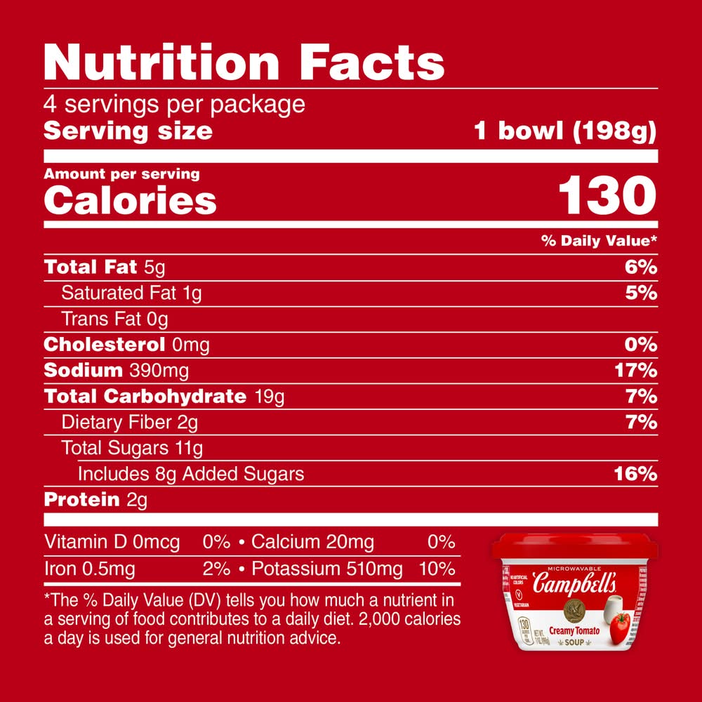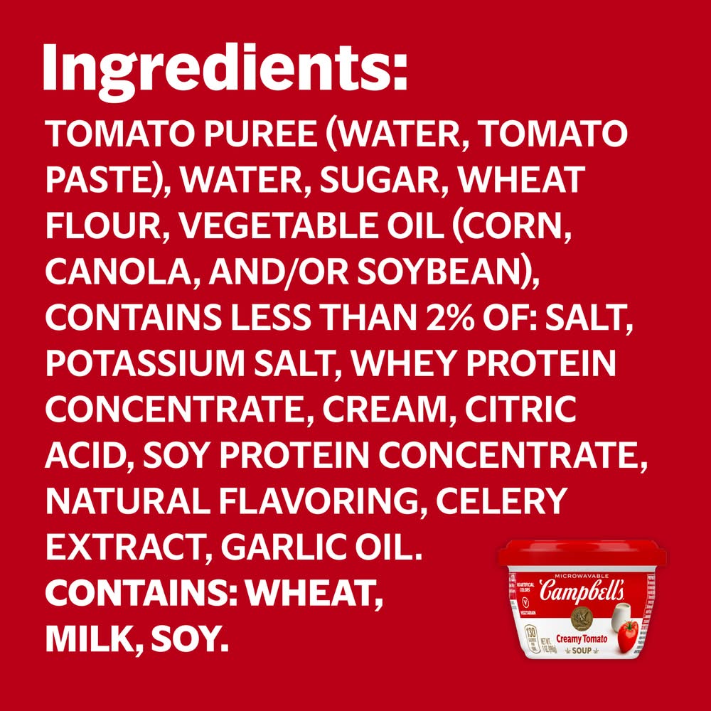 Take this twist on classic flavors you know and love on the road with Campbell's Creamy Tomato Soup. Every spoonful of this comforting tomato soup is crafted with delicious ingredients you grew up on. The tangy taste of sun-ripened tomatoes and dairy cream makes this soup a delicious and nostalgic choice anytime, anywhere. This vegetarian soup is made without high fructose corn syrup or artificial colors for a snack you can feel good about. Just pop off the cap, peel back the cover, replace the cap and microwave for one minute. Let this easy to microwave soup sit for another minute and enjoy! Take this instant soup on the go for an easy, portable snack, appetizer or side dish for a delicious lunch. The microwavable soup bowl makes it easy to enjoy, no dishes required. Embark on your next adventure with Campbell's soups along for the ride. M'm M'm Good! Packaging: Reusable