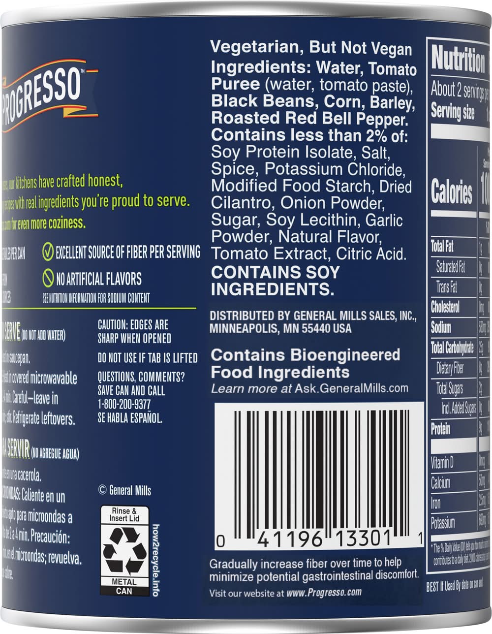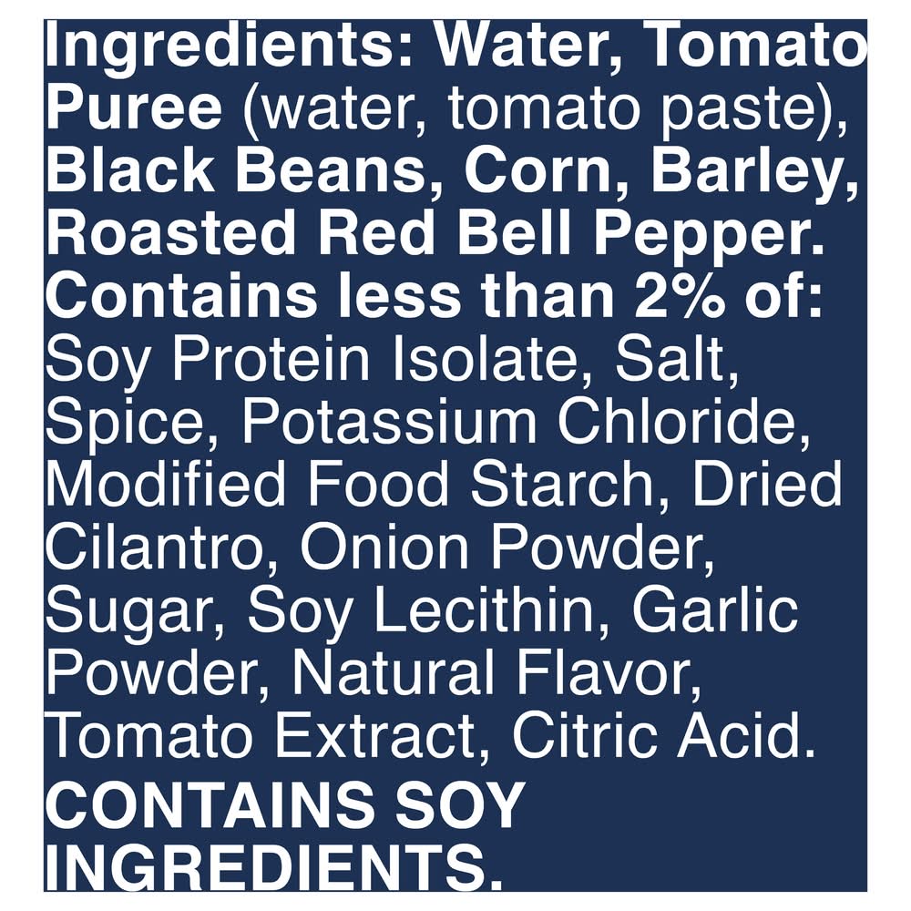 Ingredients: Water, Tomato Puree (water, tomato paste), Black Beans, Corn, Barley, Roasted Red Bell Pepper. Contains less than 2% of: Soy Protein Isolate, Salt, Spice, Potassium Chloride, Modified Food Starch, Dried Cilantro, Onion Powder, Sugar, Soy Lecithin, Garlic Powder, Natural Flavor, Tomato Extract, Citric Acid. Contains: Soy