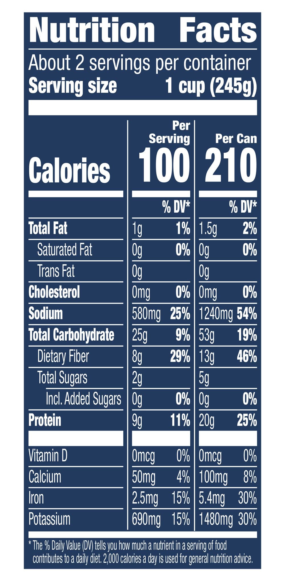Offers a rich blend of flavors and nutrients. Each can contains 20 grams of protein, contributing to a satisfying meal. With 100 calories, no saturated fat, 580 milligrams of sodium, 2 grams of sugars, and 8 grams of fiber per 1 cup serving, it provides a balance of taste and health benefits. The fiber content, sourced from half a cup of vegetables in every can, makes it an excellent source of this essential nutrient. While vegetarian, it is important to note that it is not suitable for a vegan diet. The soup is free from artificial flavors and colors, ensuring a natural dining experience. It also includes bioengineered food ingredients. To accommodate dietary fiber intake, it is recommended to increase fiber consumption gradually. Packaging: Reusable