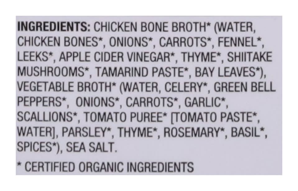 Ingredients: Chicken Bone Broth* (Water, Chicken Bones*, Onions*, Carrots*, Fennel*, Leeks*, Apple Cider Vinegar*, Thyme*, Shiitake Mushrooms*, Tamarind Paste*, Bay Leaves*), Vegetable Broth* (Water, Celery*, Green Bell Peppers*, Onions*, Carrots*, Garlic*, Scallions*, Tomato Puree* [Tomato Paste*, Water], Parsley*, Thyme*, Rosemary*, Basil*, Spices*), Sea Salt. * Certified Organic Ingredients Contains: Celery