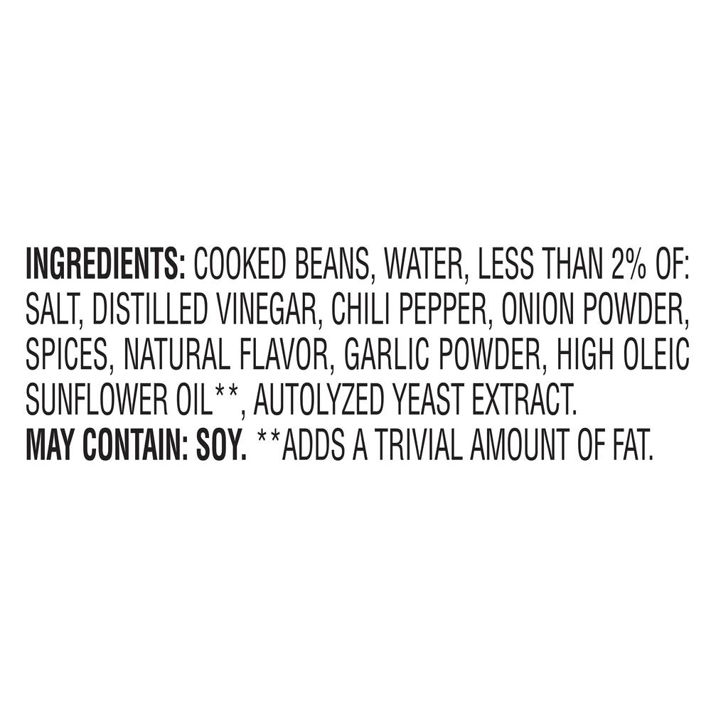 Ingredients: Cooked Beans, Water, Less than 2% of: Salt, Distilled Vinegar, Chili Pepper, Onion Powder, Spices, Natural Flavor, Garlic Powder, High Oleic Sunflower Oil**, Autolyzed Yeast Extract. MAY CONTAIN: SOY. **Adds a trivial amount of fat. Contains: Soy