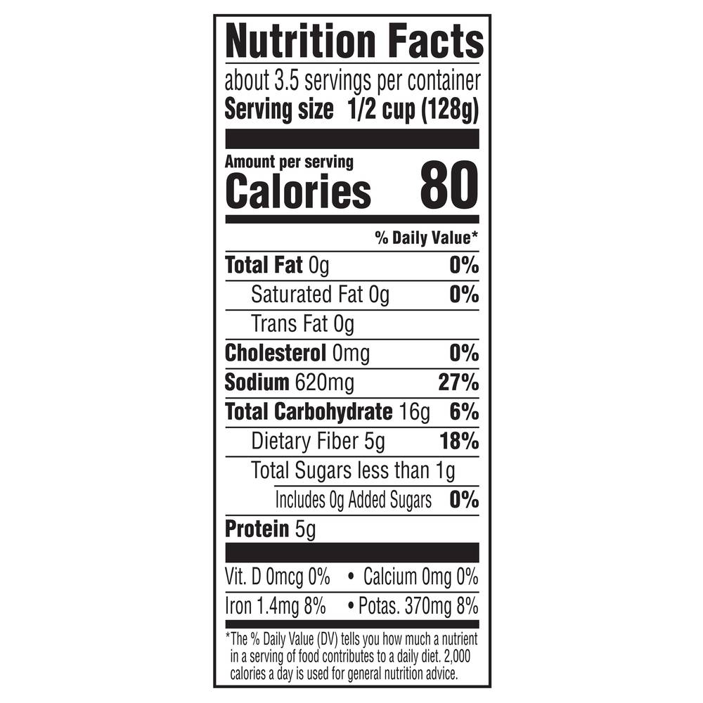 These are a fiber-rich food that contains no artificial colors or flavors. Each half-cup serving provides 80 calories and less than 1 gram of total sugars. The sodium content per serving is 620 milligrams, which is 27% of the daily value. It is advisable to consult the nutrition information for sodium content if necessary. • Conagra Brands, PO Box 3534,Chicago,IL,60654 • Packaging: Reusable