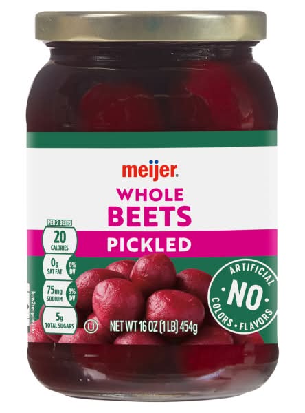 Meijer Whole Pickled Beets are whole pickled beets characterized by an earthy taste enhanced by seasoning. These beets are suitable for use as a standalone side dish or can be roasted with a parsley garnish. They possess a vibrant red-purple color and are designed to add a unique tanginess to dishes, offering a fresh taste.