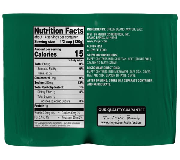You don't have to grow a garden to enjoy canned green beans! From cassarolles to sauteed, Meijer Cut Green Beans are full of that green goodness you know and love in every bite. These canned veggies are as delicious as they are nutritious, and can bring out the best flavor from your steaks, chicken or other entrees with ease. Packaging: Reusable