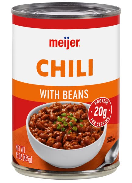 Enjoy a classic comfort food in minutes with Meijer Chili with Beans. Bursting with the rich flavors of tender beef, pork, beans, green chile, tomato and bold spices, this canned classic is perfect as a side, in a casserole, or on top of a hot dog! Just warm up in the microwave or on the stovetop to enjoy a hearty meal the entire family will love.
