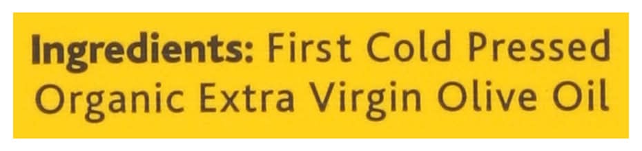 Ingredients: First Cold Pressed Organic Extra Virgin Olive Oil