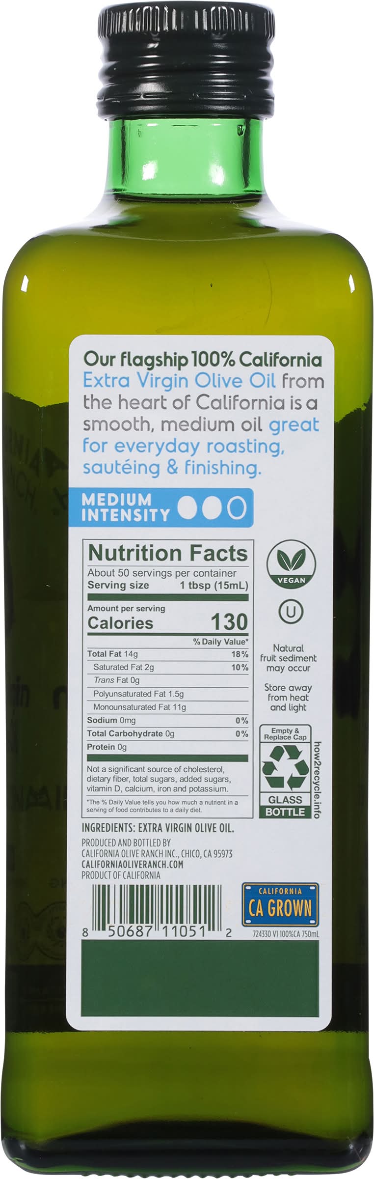 It is a rich and vibrant oil, cold-pressed to preserve its natural flavors. It is sourced exclusively from California ranches and a network of family farmers, ensuring a product that is 100% Californian. The olive oil is certified extra virgin by an applied sensory panel, confirming its high quality. As a natural product, the presence of fruit sediment may occur. It is a member of the Olive Oil Commission of California and proudly grown in California. • California Olive Ranch Inc., Chico, CA, 95973 • Packaging: Reusable