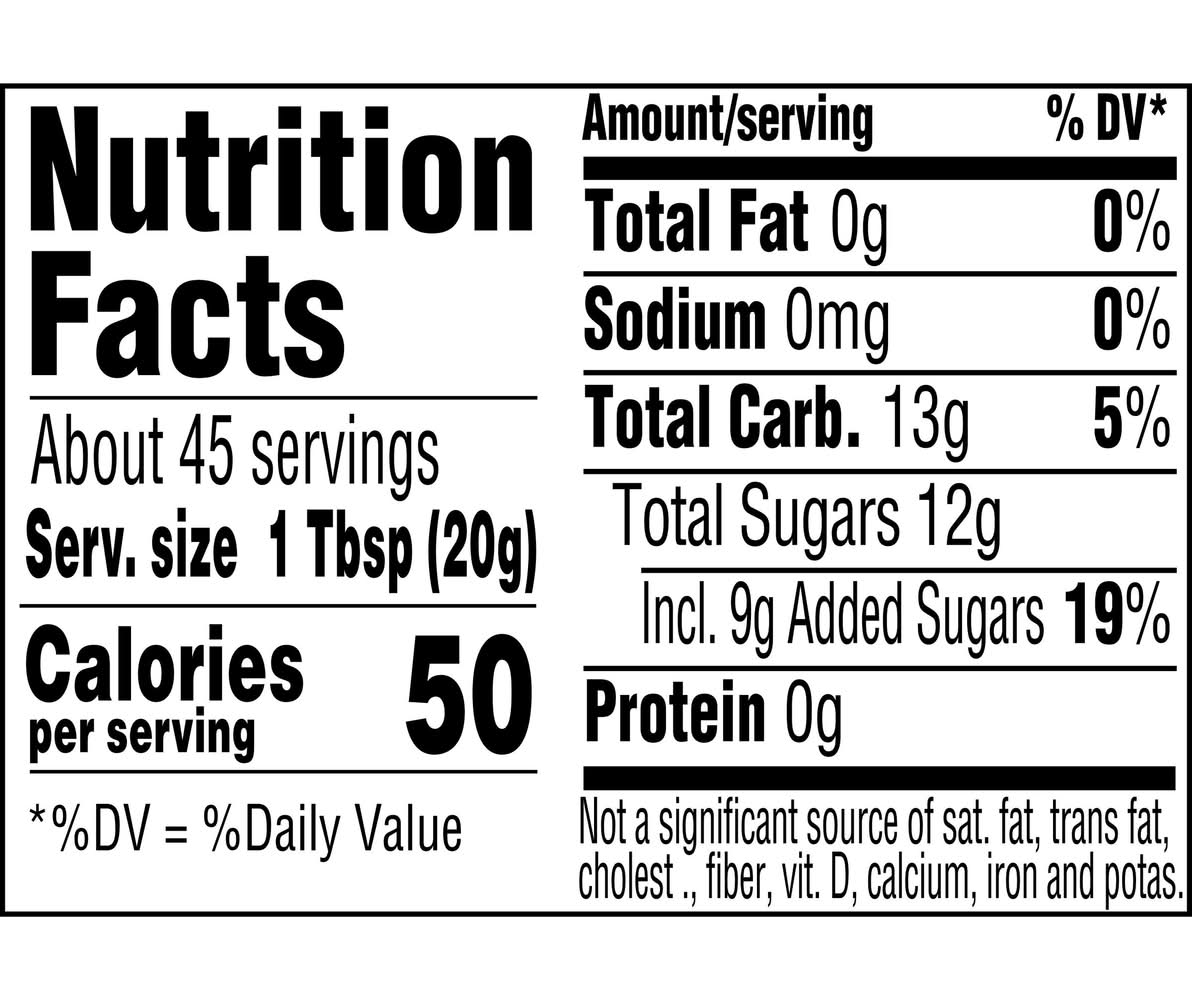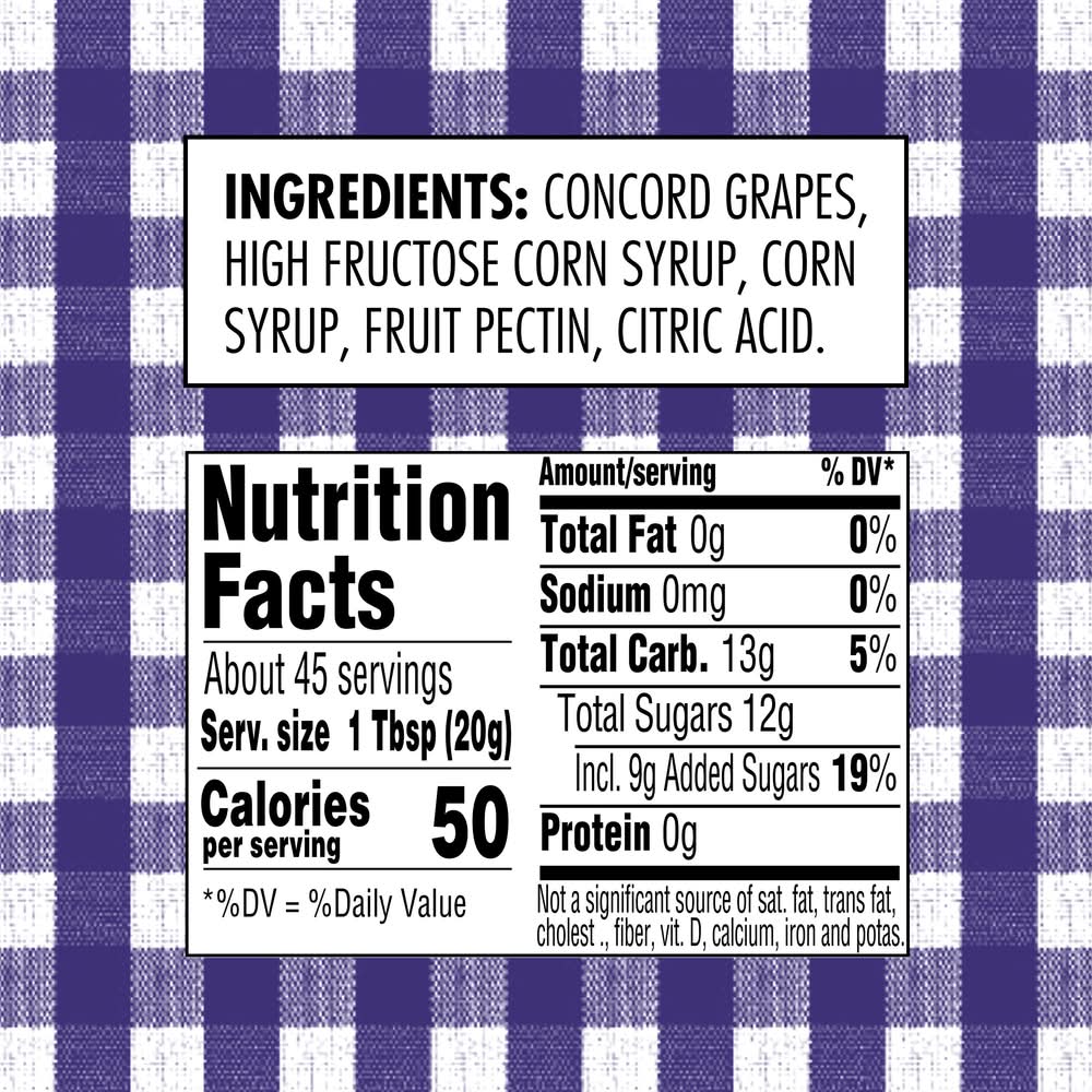 Since 1897. Per 1 Tbsp: 50 calories; 0 g sat fat (0% DV); 0 mg sodium (0% DV); 12 g sugars. Recipes - Gifts Flavor: Grape