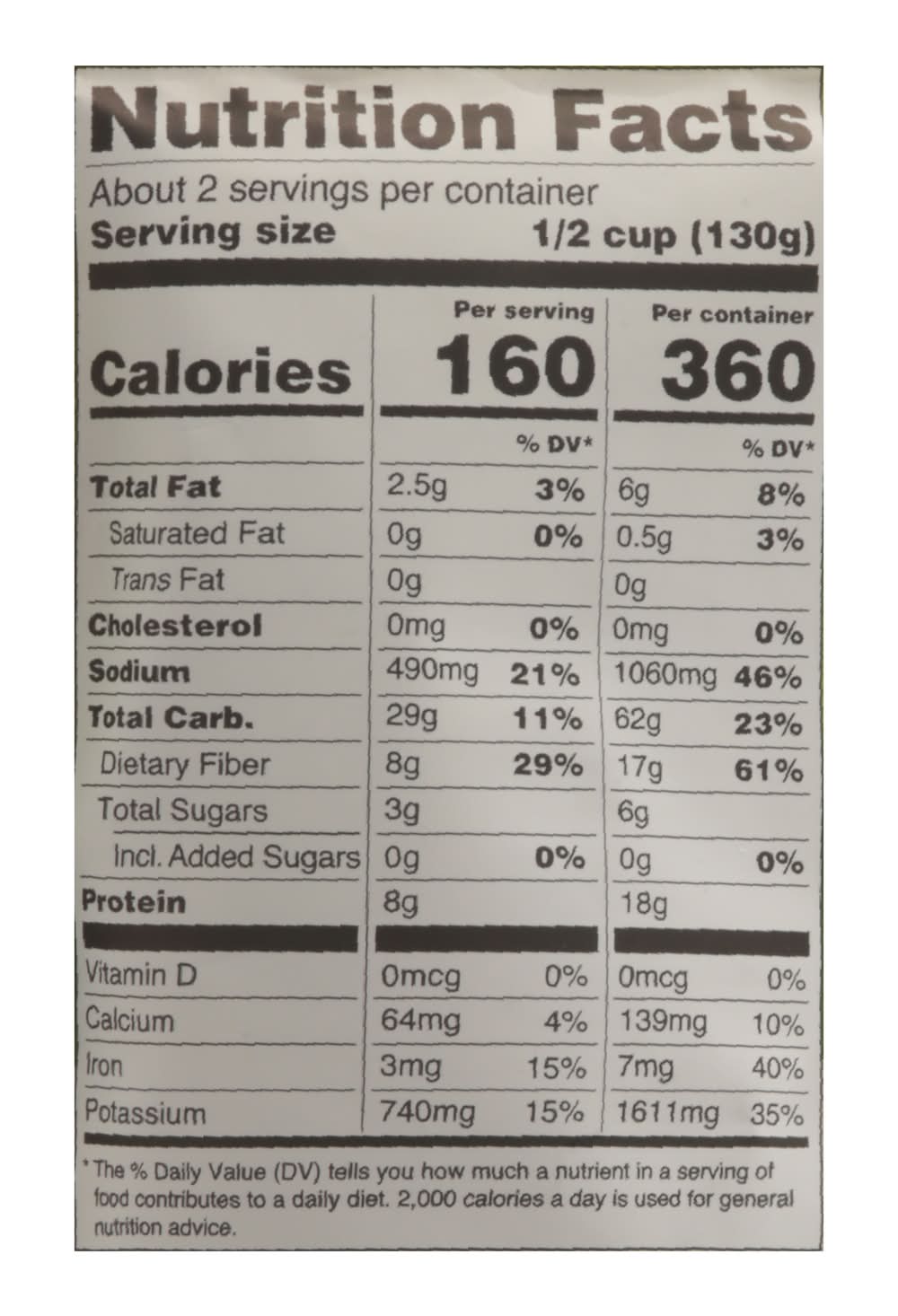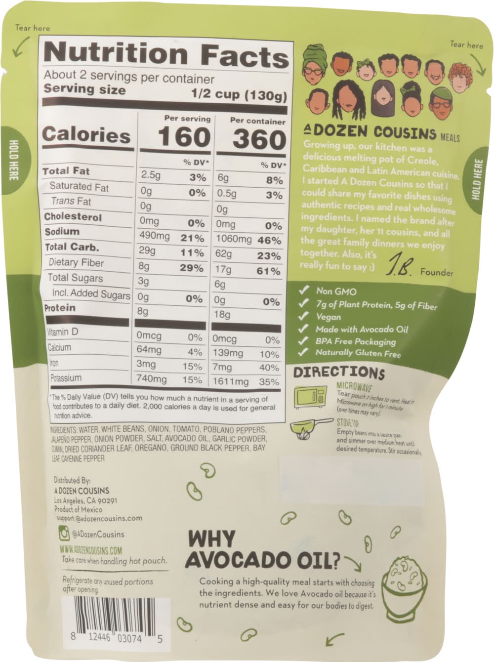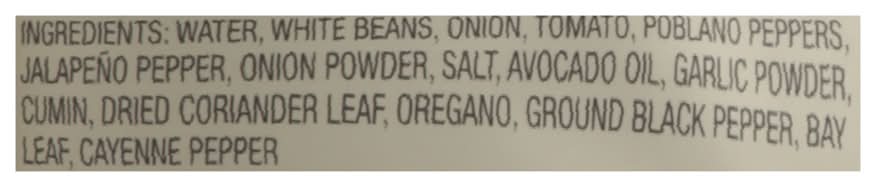 Ingredients: Water, White Beans, Onion, Tomato, Poblano Peppers, Jalapeno Pepper, Onion Powder, Salt, Avocado Oil, Garlic Powder, Cumin, Dried Coriander Leaf, Oregano, Ground Black Pepper, Bay Leaf, Cayenne Pepper