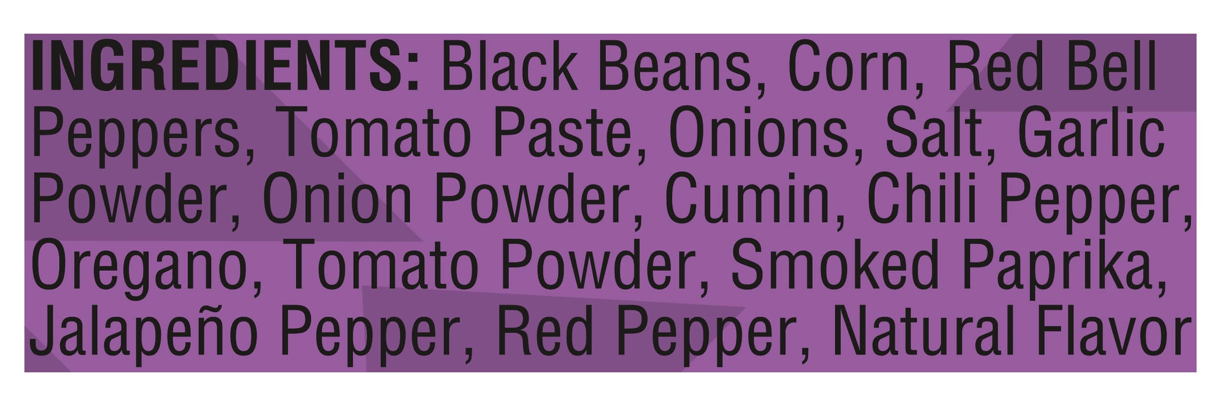 Ingredients: Black Beans, Corn, Red Bell Peppers, Tomato Paste, Onions, Salt, Garlic Powder, Onion Powder, Cumin, Chili Pepper, Oregano, Tomato Powder, Smoked Paprika, Jalapeno Pepper, Red Pepper, Natural Flavor Contains: Wheat, Tree Nuts, Milk, Soybeans