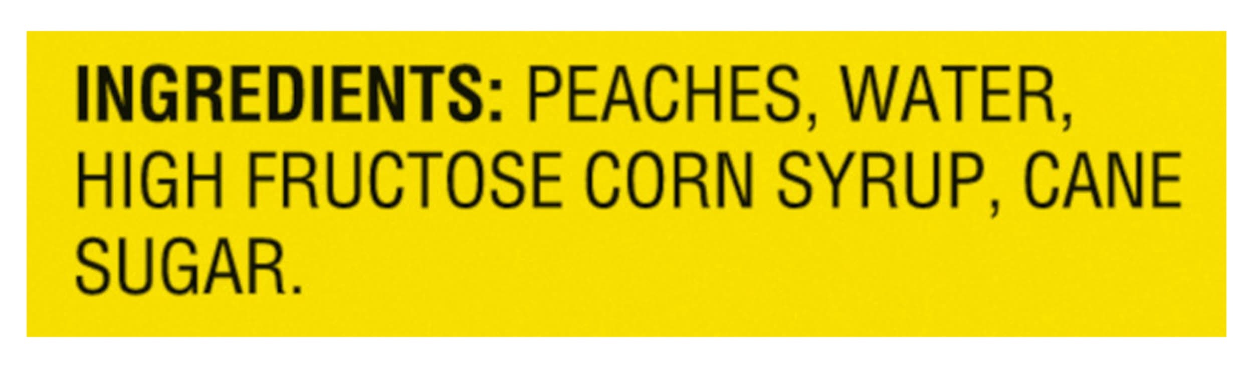 Ingredients: Peaches, Water, High Fructose Corn Syrup, Cane Sugar Contains: Corn