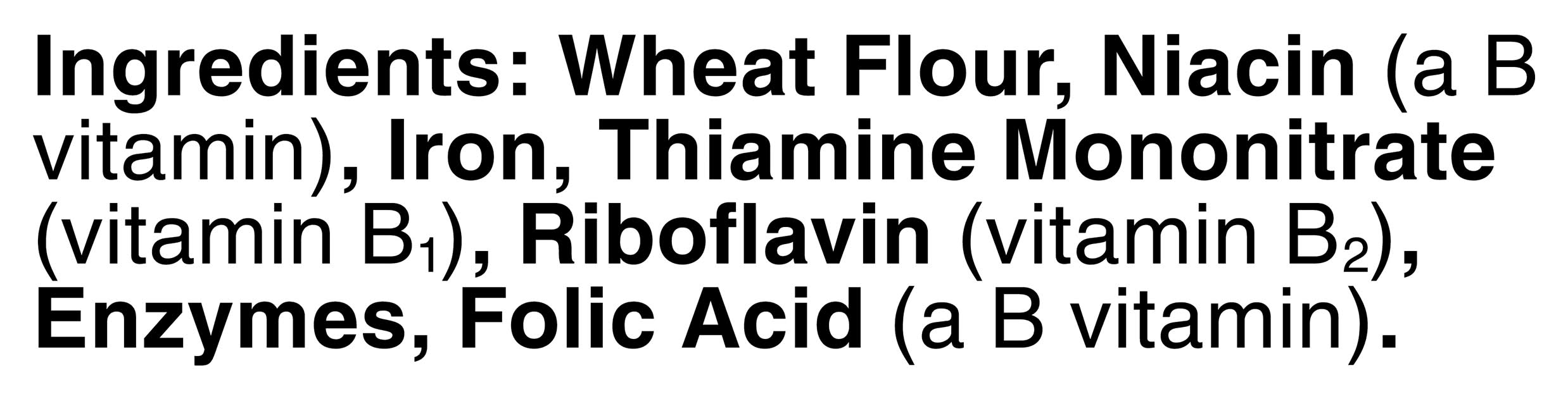 Ingredients: Wheat Flour, Niacin (a B Vitamin), Iron, Thiamine Mononitrate (Vitamin B1), Riboflavin (Vitamin B2), Enzymes, Folic Acid (a B Vitamin) Contains: Wheat