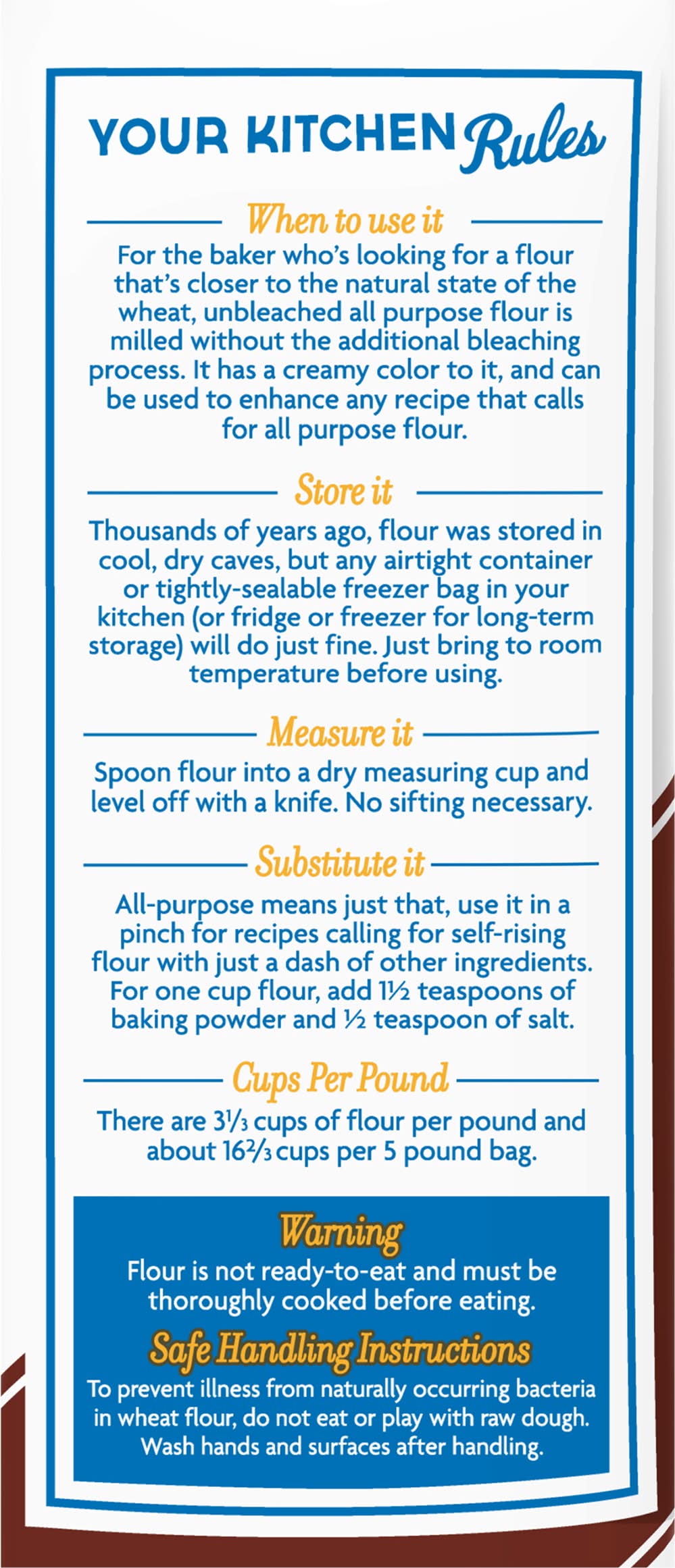 Directions for use: Usage of instructions:Your Kitchen Rules: When to Use it: For the baker who's looking for a flour that's closer to the natural state of the wheat, unbleached all purpose flour is milled without the additional bleaching process. It has a creamy color to it, and can be used to enhance any recipe that calls for all purpose flour. Measure it: Spoon flour into a dry measuring cup and level off with a knife. No sifting necessary. Substitute it: All-purpose means just that, use it in a pinch for recipes calling for self-rising flour with just a dash of other ingredients. For one cup flour, add 1-1/2 teaspoons of baking powder and 1/2 teaspoon of salt. Cups Per Pound: There are 3-1/3 cups of flour per pound and about 16-2/3 cups per 5 pound bag. - Directions: Your Kitchen Rules: When to Use it: For the baker who's looking for a flour that's closer to the natural state of the wheat, unbleached all purpose flour is milled without the additional bleaching process. It has a creamy color to it, and can be used to enhance any recipe that calls for all purpose flour. Measure it: Spoon flour into a dry measuring cup and level off with a knife. No sifting necessary. Substitute it: All-purpose means just that, use it in a pinch for recipes calling for self-rising flour with just a dash of other ingredients. For one cup flour, add 1-1/2 teaspoons of baking powder and 1/2 teaspoon of salt. Cups Per Pound: There are 3-1/3 cups of flour per pound and about 16-2/3 cups per 5 pound bag. Safe Handling Instructions: To prevent illness from naturally occurring bacteria in wheat flour, do not eat or play with raw dough. Wash hands and surfaces after handling. Cook before sneaking a taste. Flour is raw. Please cook fully before enjoying. Store It: Thousands of year ago, flour was stored in cool, dry caves, but any airtight container or tightly-sealable freezer bag in your kitchen (or fridge or freezer for long-term storage) will do just fine. Just bring to room temperature before using. Storage recommendation: Store It: Thousands of year ago, flour was stored in cool, dry caves, but any airtight container or tightly-sealable freezer bag in your kitchen (or fridge or freezer for long-term storage) will do just fine. Just bring to room temperature before using.