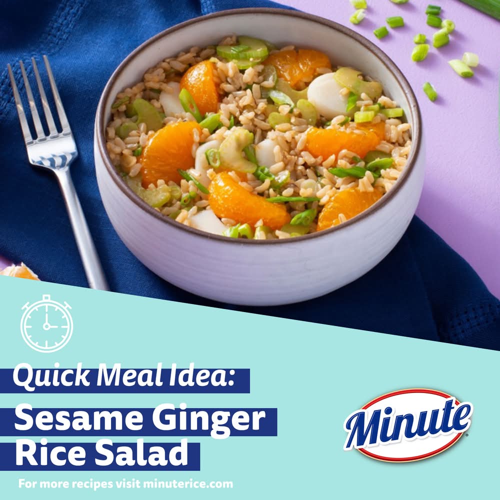 Certified Gluten free 100% whole grain. 100% Whole Grain: 50 g or more per serving. Eat 48 g or more of whole grains daily. Non-GMO Project verified. nongmoproject.org. 1 Simple Ingredient: Rice. Ready in 10 minutes. We're on a mission to make meals simple, so you have wholesome delicious meals to enjoy! Real life moves fats. We can help. Simply cooked, then dried. Nothing added but convenience. minuterice.com. how2recycle.info. Share your recipes and thoughts (at)MinuteRiceUS. Pinterest. Instagram. Facebook. Twitter. (hashtag) Rice Your Way. Spinach and Bacon Casserole: Find the recipe at minuterice.com/recipe. For more servings, visit minute rice/cooking. Try our other great products. Ready in 1 minute. Keep life simple with our Ready to Serve cups. White rice; Brown rice; Jasmine rice; Brown rice & quinoa; Basmati rice. Good fast options perfect anytime, anywhere. Ready when you are. Sustainable Forestry Initiative: Certified sourcing. Rice: Grown in the USA. • Riviana Foods Inc., Houston,TX,77019 • Packaging: Reusable