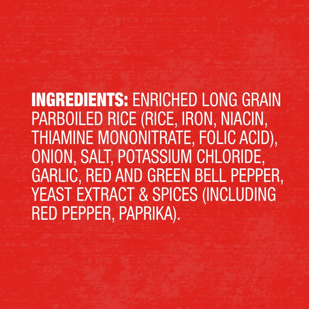 Ingredients: Enriched Long Grain Parboiled Rice (Rice, Iron, Niacin, Thiamine Mononitrate, Folic Acid), Onion, Salt, Potassium Chloride, Garlic, Red and Green Bell Pepper, Yeast Extract Spices (Including Red Pepper, Paprika).