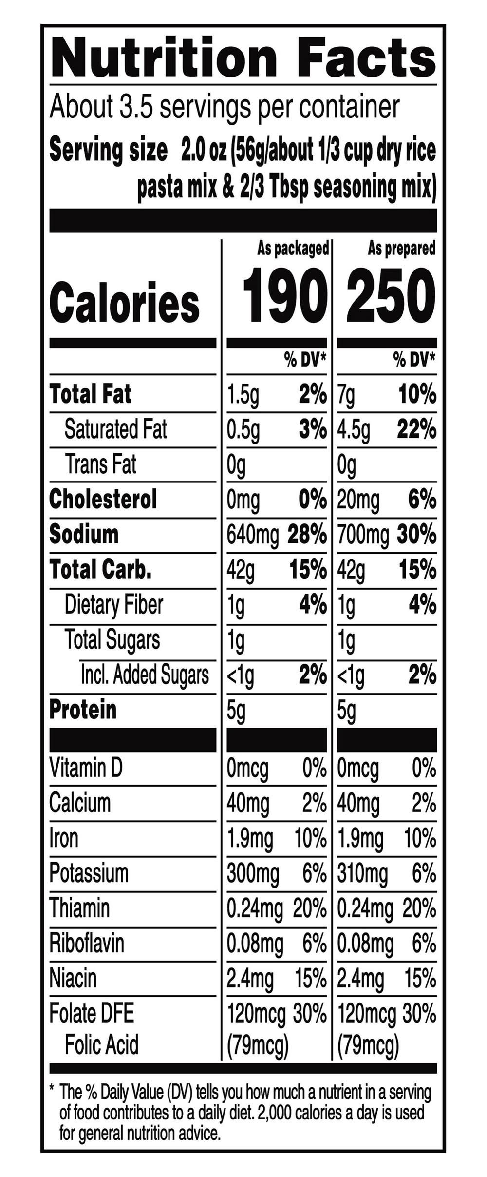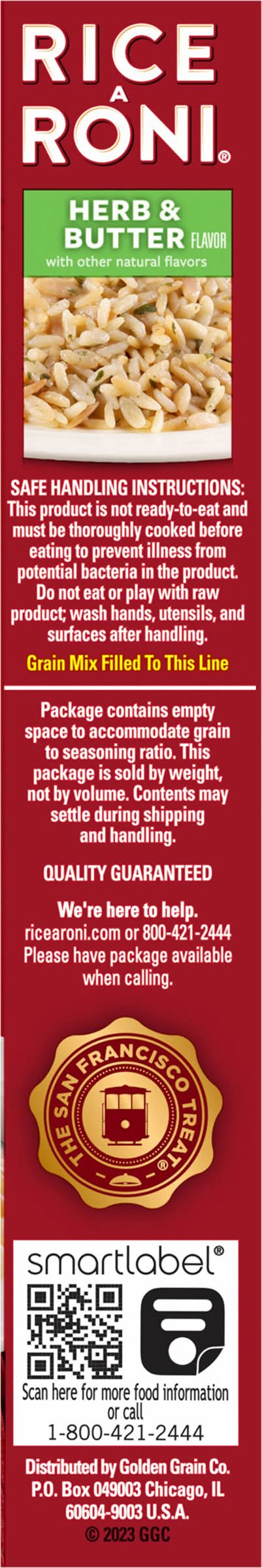Herbs and butter with other natural flavors. Per Serving: 190 calories; 0.5 g sat fat (3% DV); 640 mg sodium (28% DV); Less than 1 g added sugars (2% DV). Est. 1958. The San Francisco Treat. Making home made easy. See side panels for additional product information. Package contains empty space to accommodate grain to seasoning ratio. This package is sold by weight, not by volume. Contents may settle during shipping and handling. Quality guaranteed. • Flavor: Herb & butter • Golden grain co., P.O. Box 049003, Chicago, IL, 60604-9003 • Packaging: Reusable