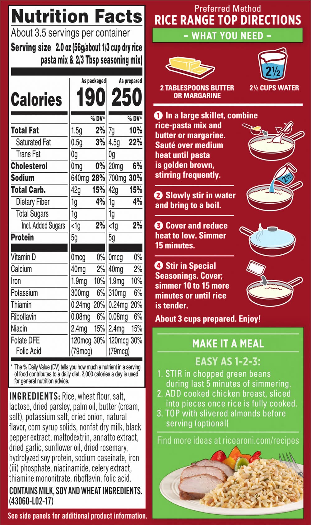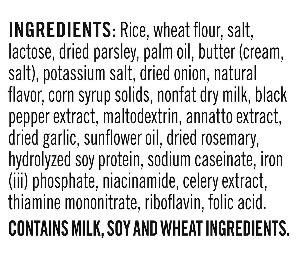 Ingredients: Rice, Wheat Flour, Salt, Lactose, Dried Parsley, Palm Oil, Butter (Cream, Salt), Potassium Salt, Dried Onion, Natural Flavor, Corn Syrup Solids, Nonfat Dry Milk, Black Pepper Extract, Maltodextrin, Annatto Extract, Dried Garlic, Sunflower Oil, Dried Rosemary, Hydrolyzed Soy Protein, Sodium Caseinate, Iron (III) Phosphate, Niacinamide, Celery Extract, Thiamine Mononitrate, Riboflavin, Folic Acid. 43060-L02-17 Contains: Milk, Soybeans, Wheat, Lactose, Corn, Celery
