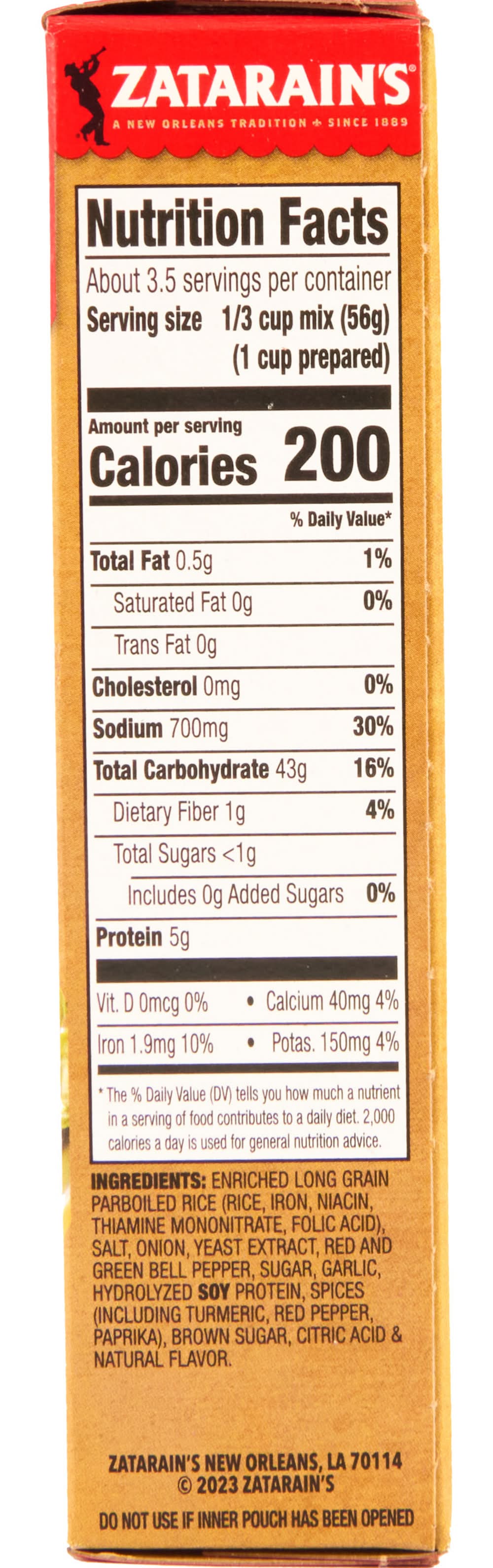 Ingredients: Enriched Long Grain Parboiled Rice (Rice, Iron, Niacin, Thiamine Mononitrate, Folic Acid), Salt, Onion, Yeast Extract, Red and Green Bell Pepper, Sugar, Garlic, Hydrolyzed Soy Protein, Spices (Including Turmeric, Red Pepper, Paprika), Brown Sugar, Citric Acid & Natural Flavor Contains: Soy