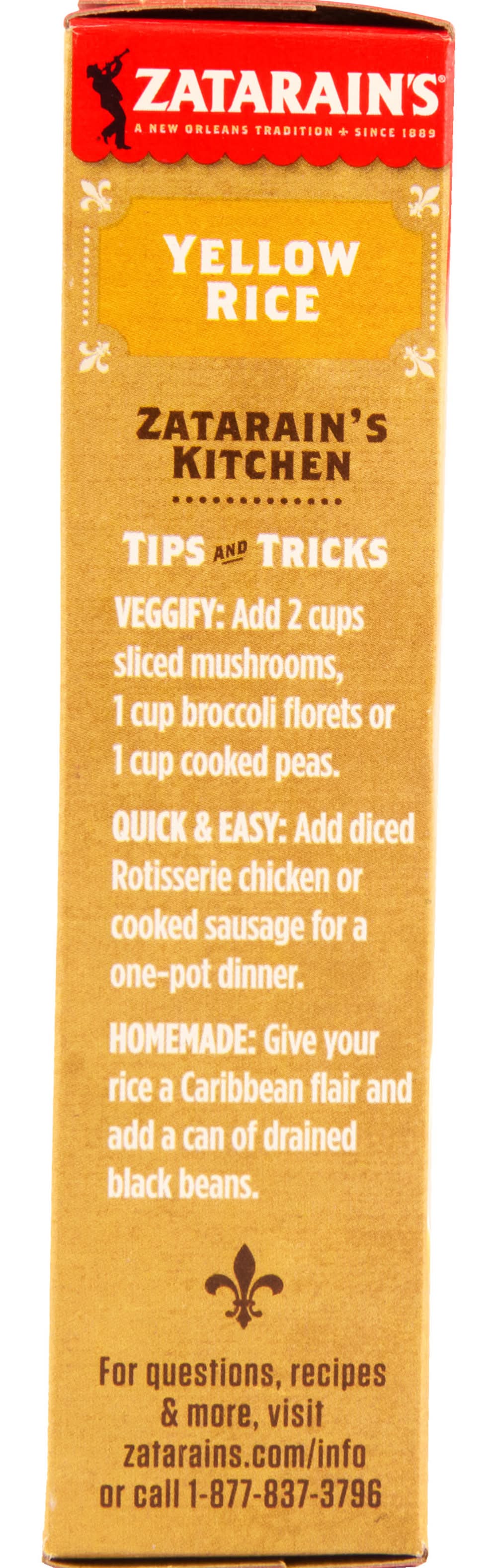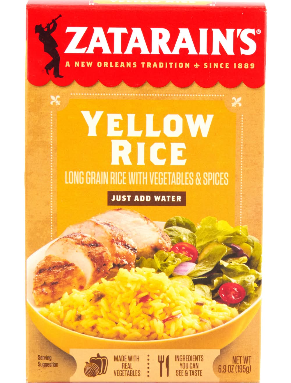 Long grain rice with vegetables & spices. Gluten free. A New Orleans tradition. Since 1889. Just add water. Ingredients you can see & taste. Yellow rice, or Arroz Amarillo in Spanish, is a culinary staple in nearly every Latin American culture. Zatarain's, New Orleans, LA, 70114