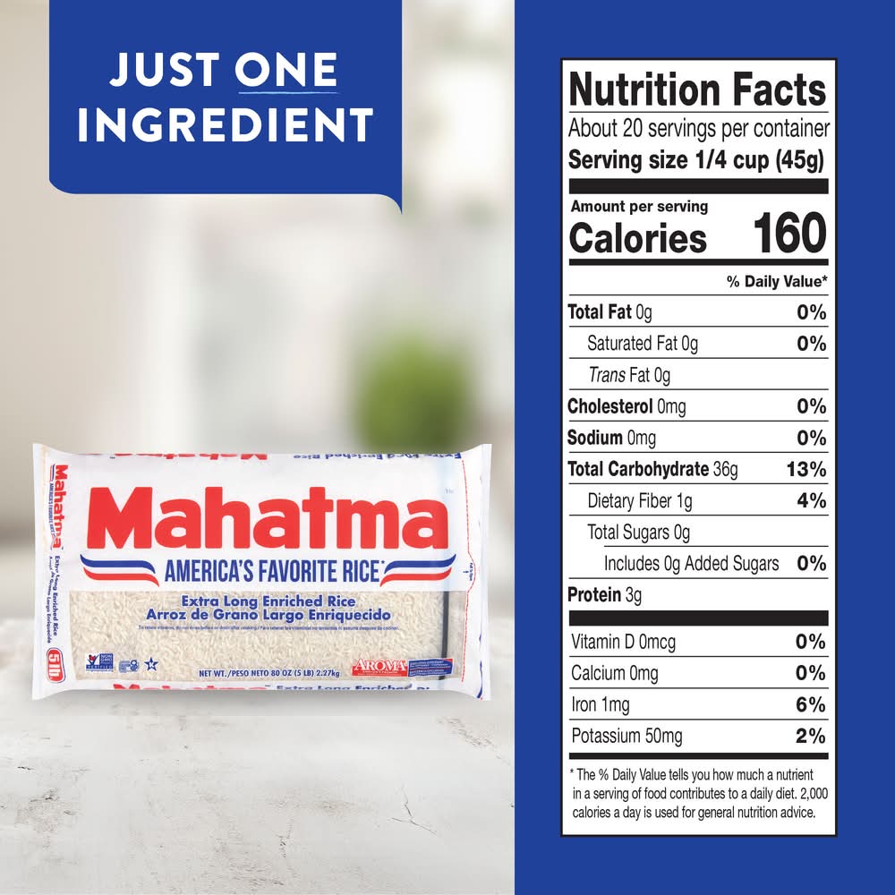 Serve your family nothing but the best quality with Mahatma® Enriched Extra Long Grain White Rice. Ideal for an array of breakfast, lunch, and dinner dishes, these grains cook to fluffy perfection thanks to their extra-long shape that releases less starch when cooking for light granules that never stick. Naturally Gluten Free, with no preservatives, and Non-GMO Project Verified, you can be sure that your family meals are delicious and nutritious. Riviana foods inc., Houston, TX, 77019