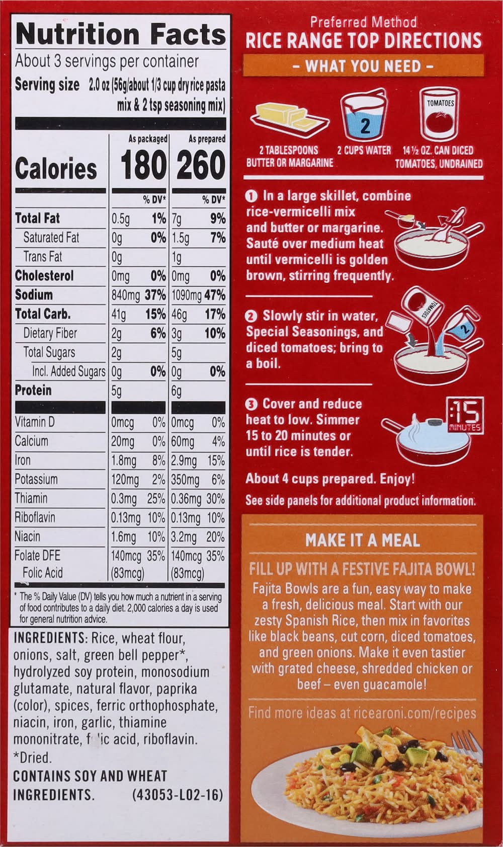 Microwave directions: in 2-quart microwaveable bowl, combine rice vermicelli mix and 2 tablespoons butter or margarine. microwave uncovered at high 1 minute. stir. microwave at high 1-2 more minutes or until vermicelli is golden brown. remove and stir in 2 1/4 cups water and special seasonings and one 14-1/2 oz, can of diced tomatoes, undrained. microwave uncovered, at high 19-21 minutes or until rice is tender. let stand 3 minutes microwave ovens vary; adjust times as needed. preferred method rice range top directions: what you need. 2 tablespoons butter or margarine. 2 cups water. 14-1/2 oz. can diced tomatoes, undrained. (1) in a large skillet, combine rice vermicelli mix and butter or margarine. saute over medium heat until vermicelli is golden brown, stirring frequently. (2)slowly stir in water, special seasonings, and diced tomatoes; bring to a boil. (3)cover and reduce heat to low. simmer 15 to 20 minutes or until rice is tender. about 4 cups prepared.