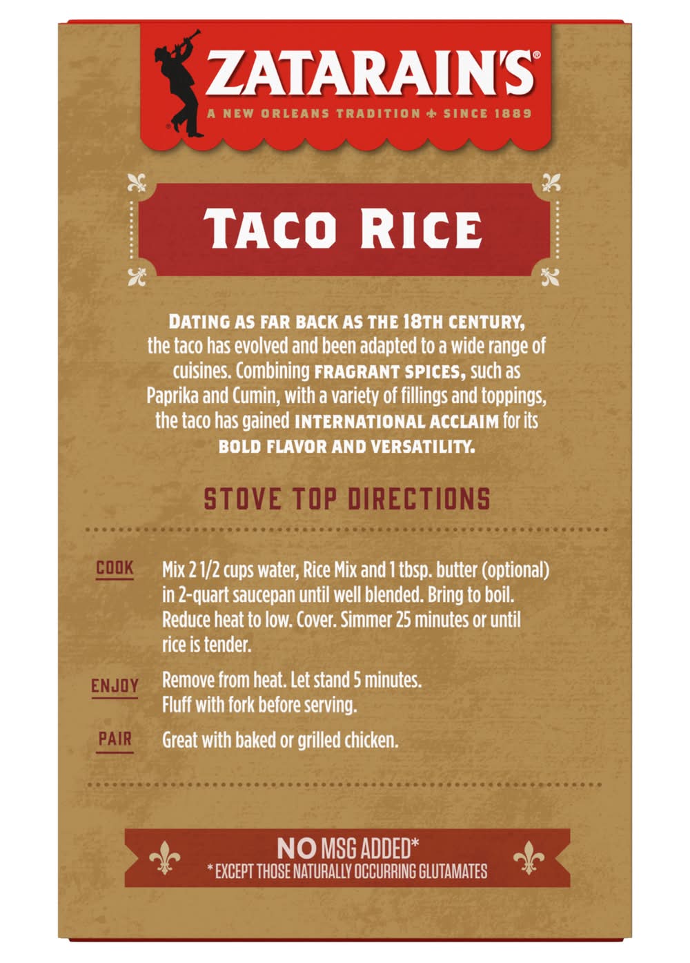 Long grain rice mix seasoned with a blend of chili pepper, cumin, tomato & red pepper. No MSG added (Except those naturally occurring glutamates). A new orleans tradition. Since 1889. Bold flavor from taco seasoning. Just add water. Ingredient you can see &taste.