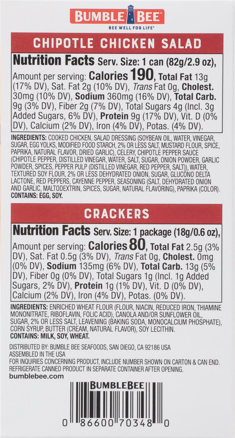Ingredients: Chipotle Chicken Salad: Cooked Chicken, Salad Dressing (Soybean Oil, Water, Vinegar, Sugar, Egg Yolks, Modified Food Starch, 2% or Less Salt, Mustard Flour, Spice, Paprika, Natural Flavor, Dried Garlic), Celery, Chipotle Pepper Sauce (Chipotle Pepper, Distilled Vinegar, Water, Salt, Sugar, Onion Powder, Garlic Powder, Spices, Pepper Pulp (Distilled Vinegar, Red Pepper, Salt)), Water, Textured Soy Flour, 2% or Less Dehydrated Onion, Sugar, Glucono Delta Lactone, Red Peppers, Cayenne Pepper, Seasoning (Salt, Dehydrated Onion and Garlic, Maltodextrin, Spices, Sugar, Natural Flavoring), Paprika (Color). Crackers: Enriched Wheat Flour (Flour, Niacin, Reduced Iron, Thiamine Mononitrate, Riboflavin, Folic Acid), Canola and/or Sunflower Oil, Sugar, 2% or Less Salt, Leavening (Baking Soda, Monocalcium Phosphate), Corn Syrup, Butter (Cream, Natural Flavor), Soy Lecithin. Contains: Soybeans, Eggs, Mustard, Celery, Wheat