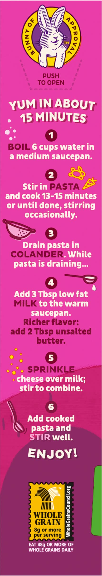 No artificial flavors or synthetic colors. Whole Grain: 8 g or more per serving. Eat 48 g or more of whole grains daily. Certified Organic by Oregon Tilth. Bunny of approval. 4 yummy shapes! Cheese from cows not treated with rBST (No significant difference has been shown between milk derived from rBST-treated and non rBST-treated cows). Box Tops for Education: No more clipping. Scan your receipt.