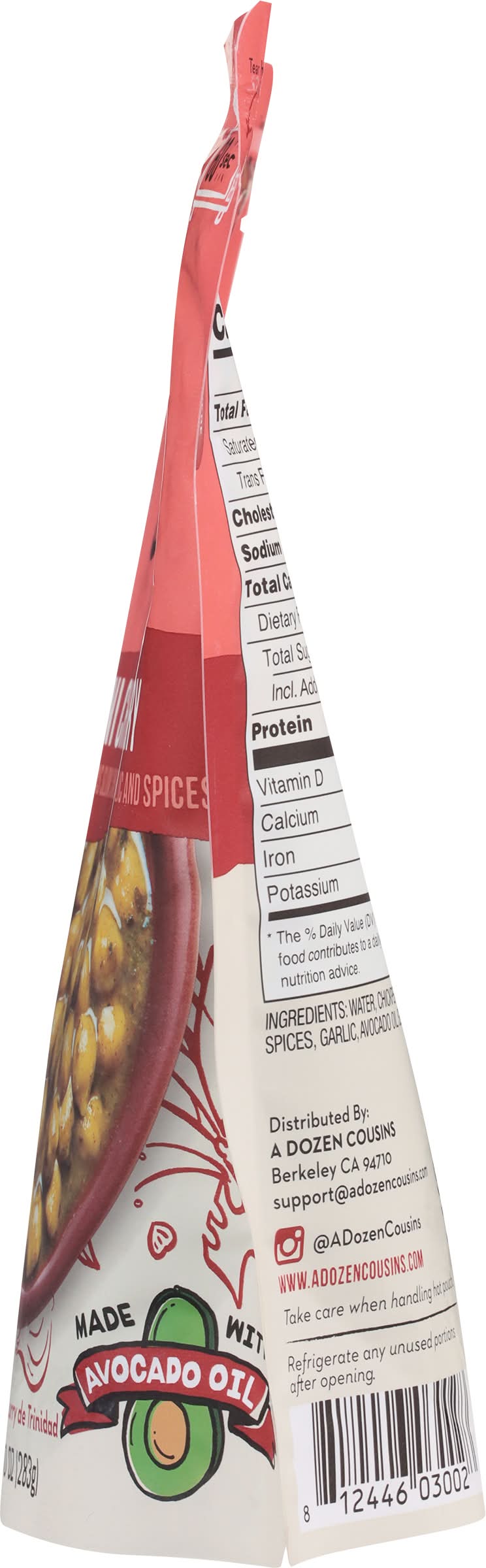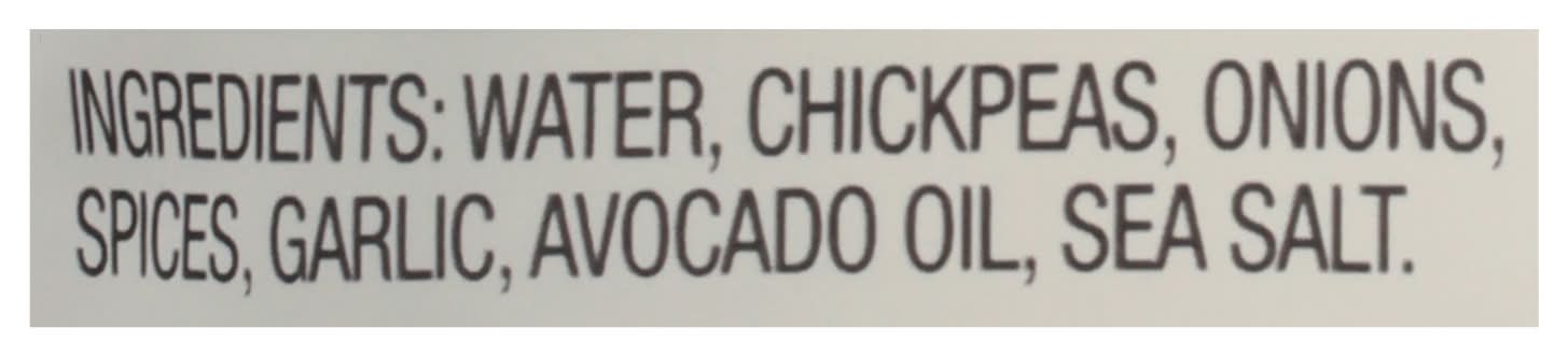 Ingredients: Water, Chickpeas, Onions, Spices, Garlic, Avocado Oil, Sea Salt Contains: 'Free From Gluten'