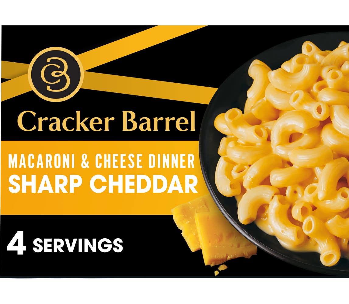 Enjoy the rich and bold cheddar taste of our Cracker Barrel Sharp Cheddar Macaroni & Cheese Box. Made with no artificial flavors or dyes, our famous mac and cheese is a savory dish that you can feel good about serving to your family. Our convenient boxed macaroni and cheese is ideal for enjoying on its own, combining with your choice of protein or veggies, or simply serving as a side dish with your main entree. Mac and cheese dinner is easy to prepare – just boil water, add pasta and cook until tender, then stir in cheese sauce packet and enjoy. Each 14 ounce box makes about four servings. The difference is in the cheese with smooth and creamy Cracker Barrel Macaroni and Cheese. • Flavor: Sharp cheddar • Kraft Foods, Chicago, IL 60601