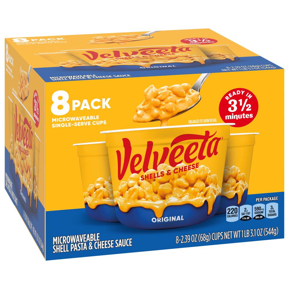 Shell yeah! Live life to the creamiest with Velveeta Shells & Cheese Original Microwaveable Pasta Cup. When your drip is as smooth as ours, you don’t waste time when it comes to delicious indulgence. For instant cheesy gratification, our original recipe hits the mark, with iconic, velvety meltability and tender pasta shells that grip the drip like no other. Velveeta’s supremely creamy texture and rich, savory taste satisfy your cravings any day of the week. Amp things up by customizing our cheesy pasta with added veggies, meat, toppings or seasonings. Sometimes unnecessary is necessary, so kick back, relax and embrace the flavor. Whether it’s in the form of a snack, side dish or entree, preparing our luxuriously convenient single-serve Velveeta Shells and Cheese cup is a breeze. Simply remove lid and sauce pouch, add water up to the fill line, microwave uncovered for 3-1/2 minutes, stir in the liquid gold cheese sauce and enjoy, unapologetically. Each box contains eight 2.39 oz cups. That’s La Dolce Velveeta! • Pack size: 8 • Kraft Heinz Foods Company, Chicago,IL,60601