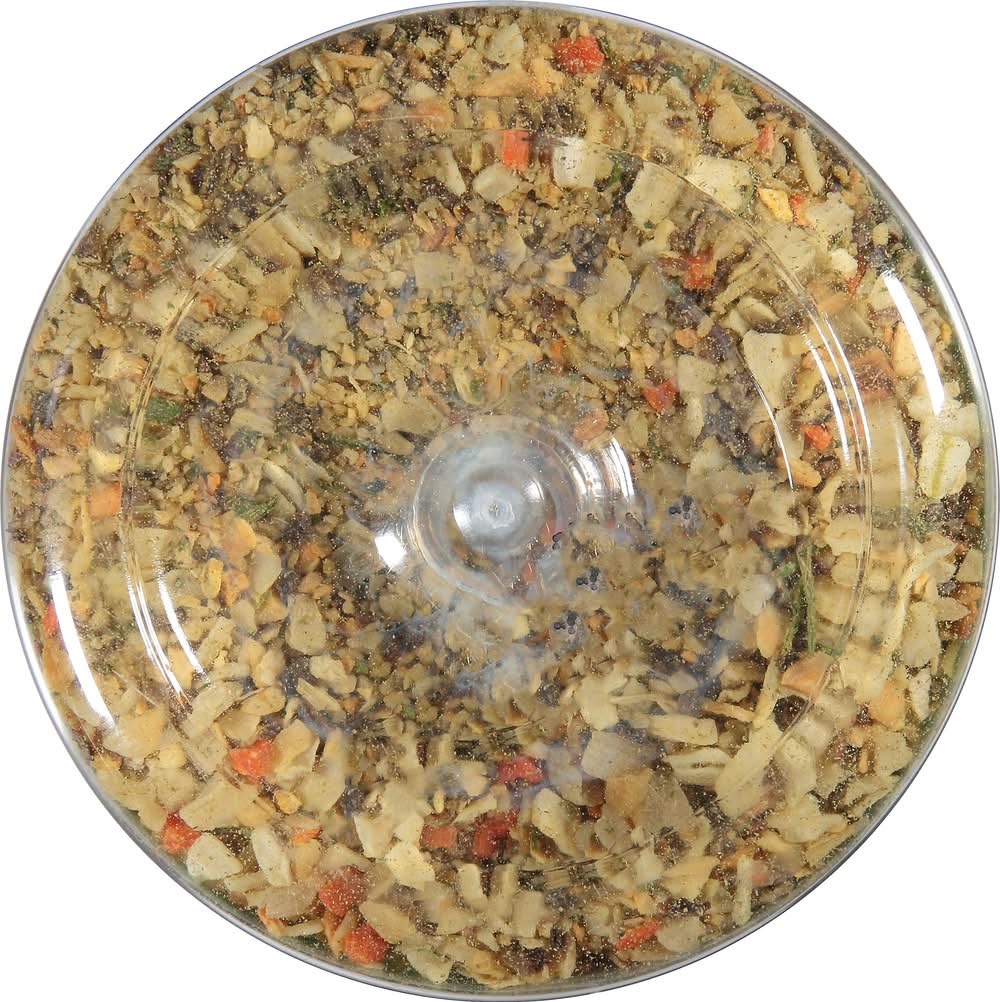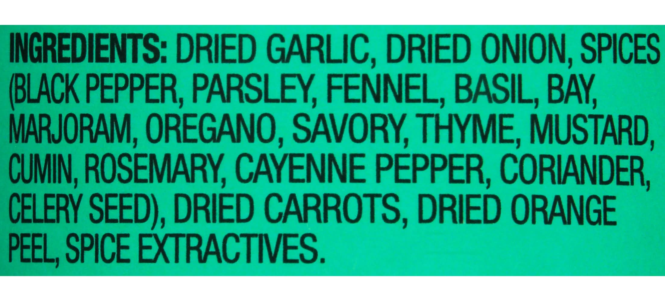 Ingredients: Dried Garlic, Dried Onion, Spices (Black Pepper, Parsley, Fennel, Basil, Bay, Marjoram, Oregano, Savory, Thyme, Mustard, Cumin, Rosemary, Cayenne Pepper, Coriander, Celery Seed), Dried Carrots, Dried Orange Peel, Spice Extractives