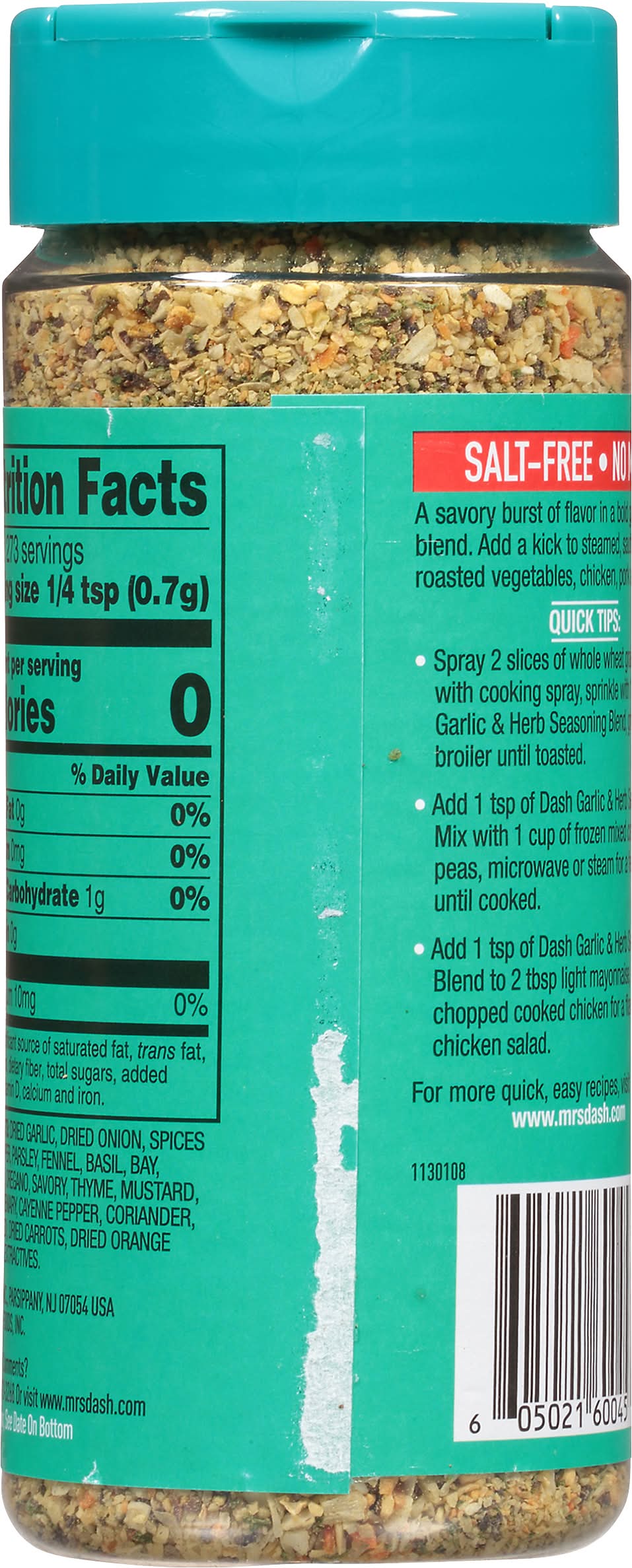 Directions: quick tips: spray 2 slices of whole wheat grain bread with cooking spray, sprinkle with 1 tsp dash garlic & herb seasoning blend, grill under broiler until toasted. add 1 tsp of dash garlic & herb seasoning mix with 1 cup of frozen mixed carrots and peas, microwave or steam for a few minutes until cooked. add 1 tsp of dash garlic & herb seasoning blend to 2 tbsp light mayonnaise, use with chopped cooked chicken for a flavorful chicken salad. for best flavor, see date on bottom.