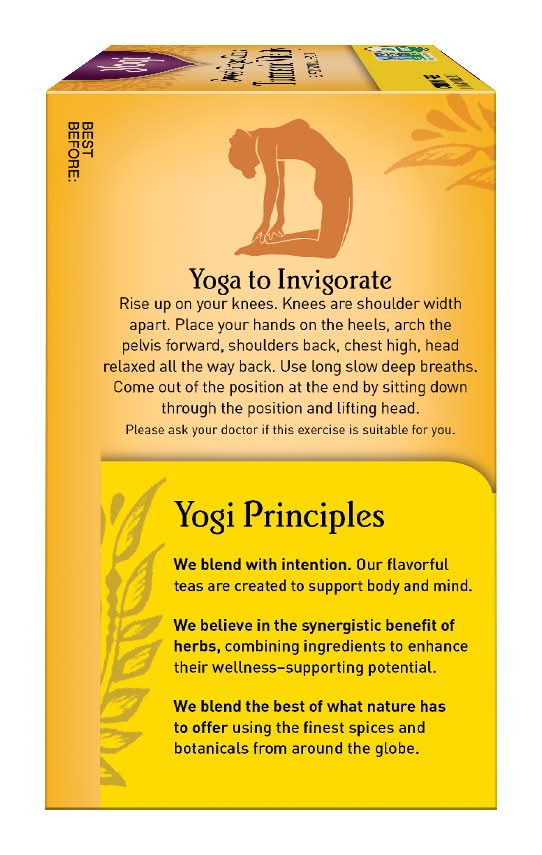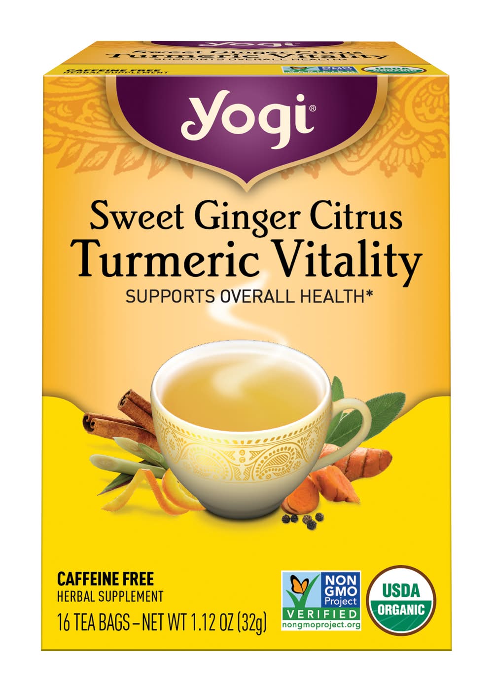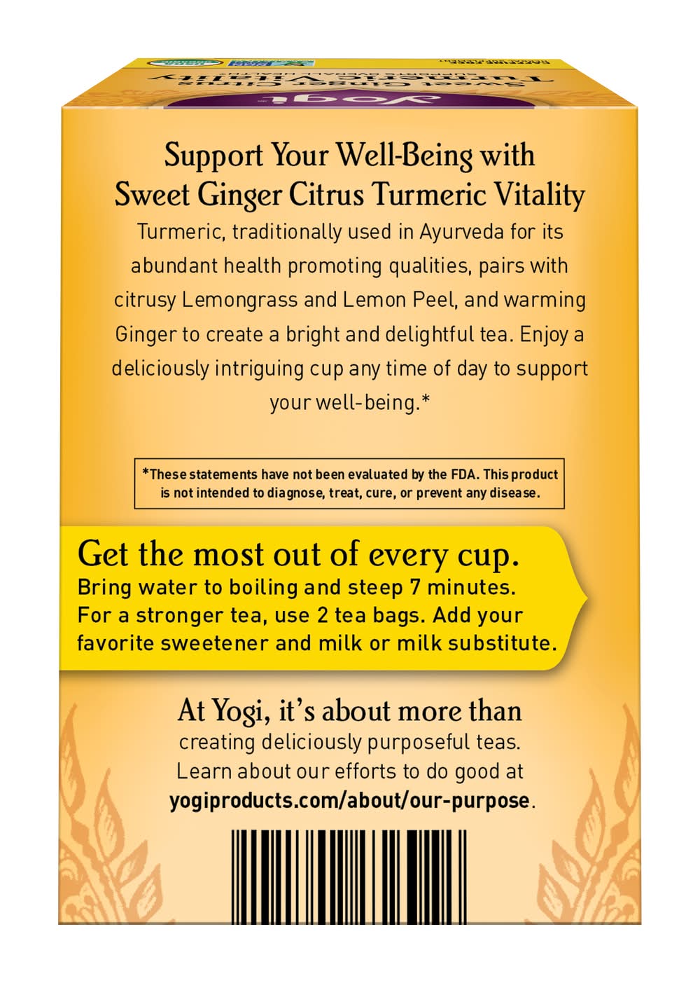 Support your well-being with Yogi Sweet Ginger Citrus Turmeric Vitality tea. Turmeric, traditionally used in Ayurveda for its abundant health-promoting qualities, pairs with citrusy Lemongrass and Lemon Peel, while warming Ginger adds notes of invigorating spice to this bright and delightful herbal tea. Enjoy a deliciously intriguing cup of Yogi Sweet Ginger Citrus Turmeric Vitality tea any time of day to support your overall health and well-being.* • Flavor: Sweet ginger-citrus-turmeric • East West Tea Company, Llc, OR, 97402 • Packaging: Reusable