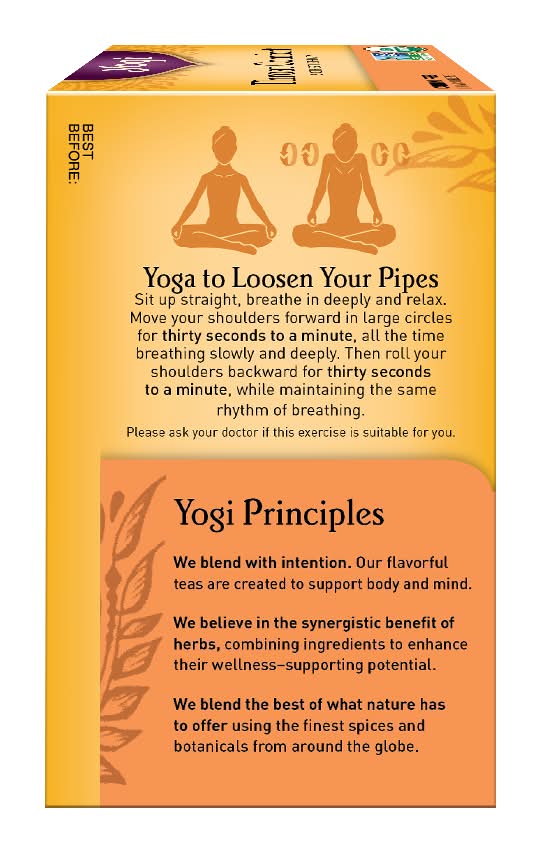 Yogi Throat Comfort® tea is an herbal tea blend that combines Licorice Root with Slippery Elm Bark; both used in Western herbalism to help relieve minor throat irritation. Wild Cherry Bark helps soothe and add sweet flavor along with fragrant Orange Peel. Enjoy Yogi Throat Comfort® tea when you need a gentle and comforting blend to soothe your throat.* • East West Tea Company, LLC, P.O. Box 21124, Eugene, OR, 97402 • Packaging: Reusable
