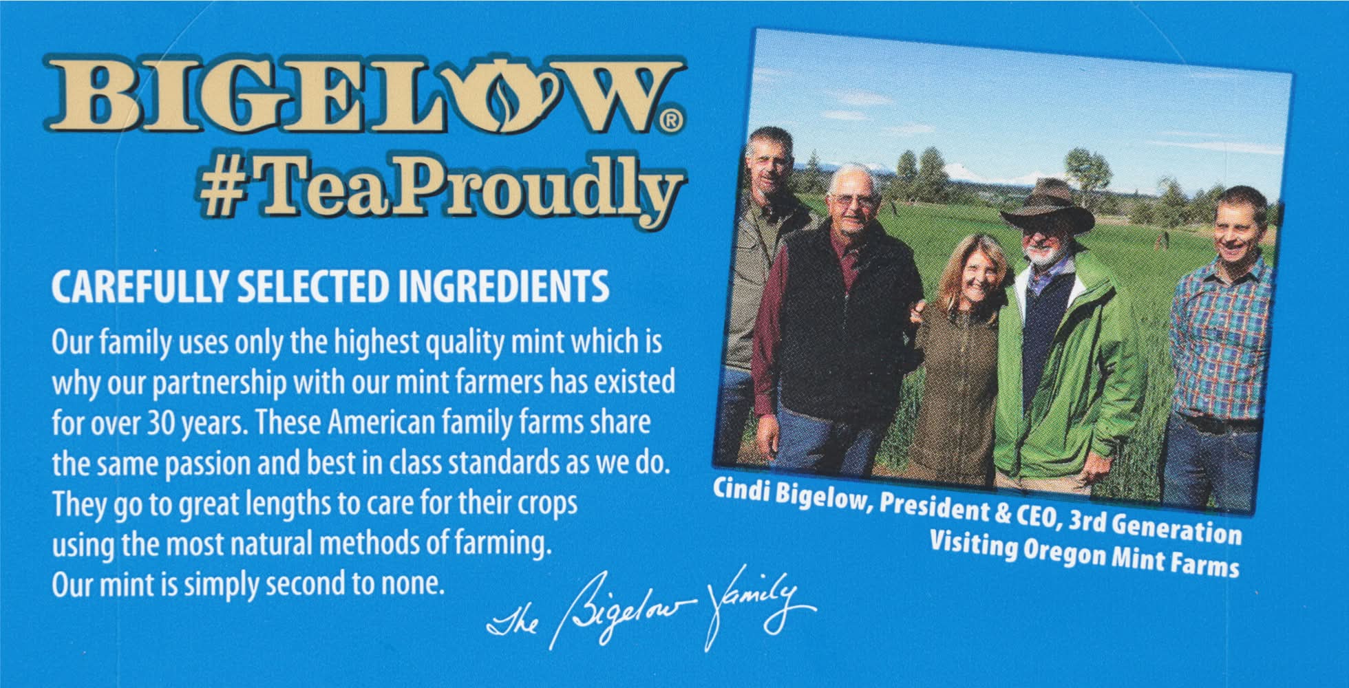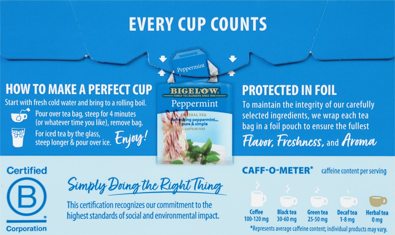 Refreshing peppermint. Pure & simple. Gluten Free. Caffeine free. Caff-O-Meter (Represent average caffeine content; individual product may vary). Caffeine content per serving. Coffee 100-120 mg. Black tea 30-60 mg. Green tea 25-50 mg. 1-8 mg. Herbal tea 0 mg. Non GMO. Family tea blenders since 1945. Tea bags individually wrapped in foil pouches. Freshness stays in. Air and moistures stay out. Carefully Selected Ingredients: Our family uses only the highest quality mint which is why our partnership with our mint farmers has existed for over 30 years. These American family farms share the same passion and best in class standards as we do. They go to great lengths to care for their crops using the most natural methods of farming. Our mint is simply second to none. - The Bigelow Family. Cindi Bigelow, President & CEO, 3rd Generation. Visiting Oregon mint farms. Every cup counts. Protected in Foil: To maintain the integrity of our carefully selected ingredients, we wrap each tea bag in a foil pouch to ensure the fullest flavor, freshness and aroma. Our Family is Proud of Our Recipe: Our peppermint has been carefully selected by the Bigelow family to deliver an uncompromised quality tea experience. Our pre peppermint is cool, refreshing and simply delicious. bigelowtea.com. (hashtag)TeaProudly. Certified B Corporation. Simply Doing the Right Thing: This certification recognizes our commitment to the highest standards of social and environmental impact. Our folding cartons are recyclable. Our tea bags are compostable. Proud to be: Zero Landfill company. Green-e: Made with 100% certified renewable energy. Proud to source the finest ingredients from the U.S.A. & around the globe. Blended & packaged in the USA. 100% American family owned.