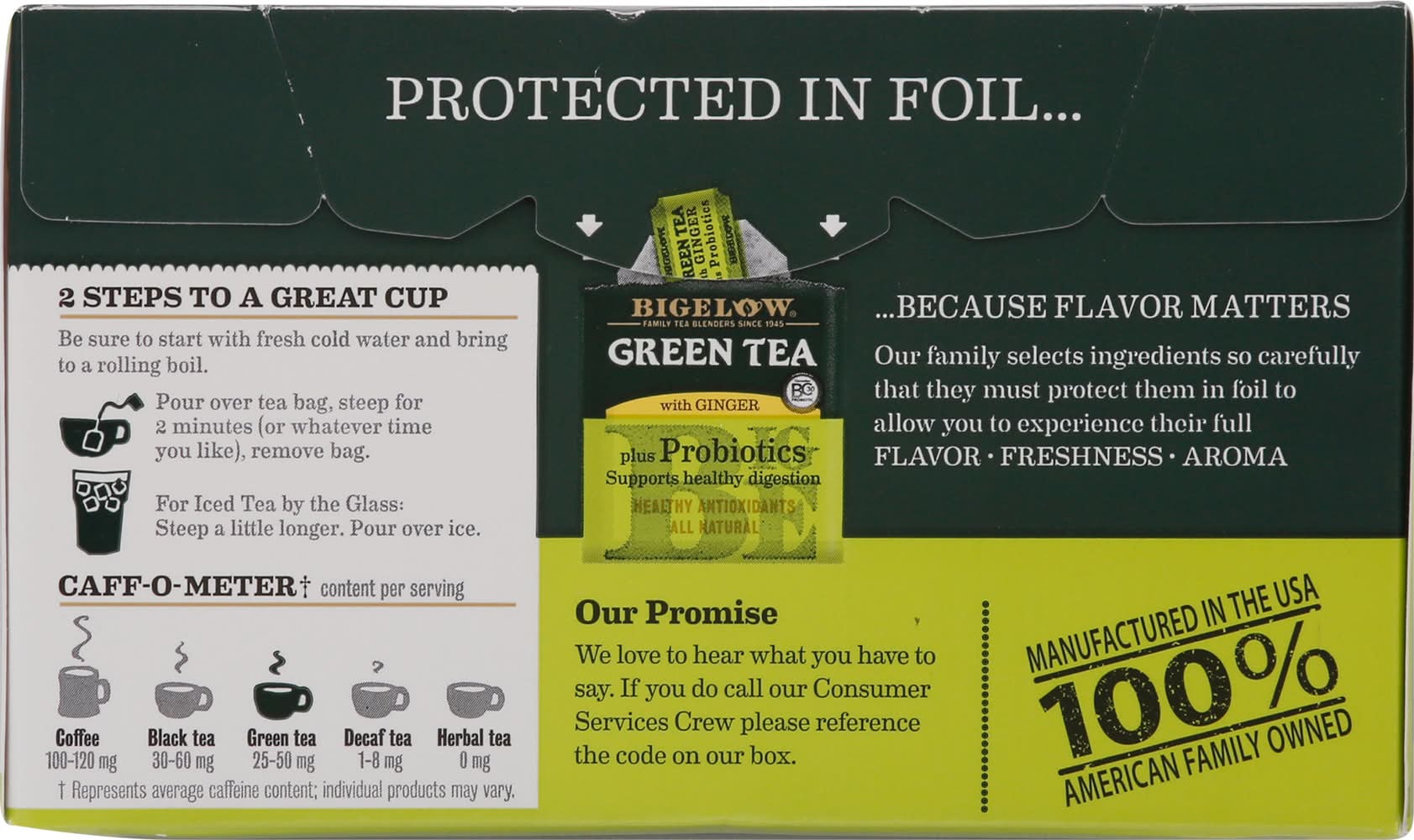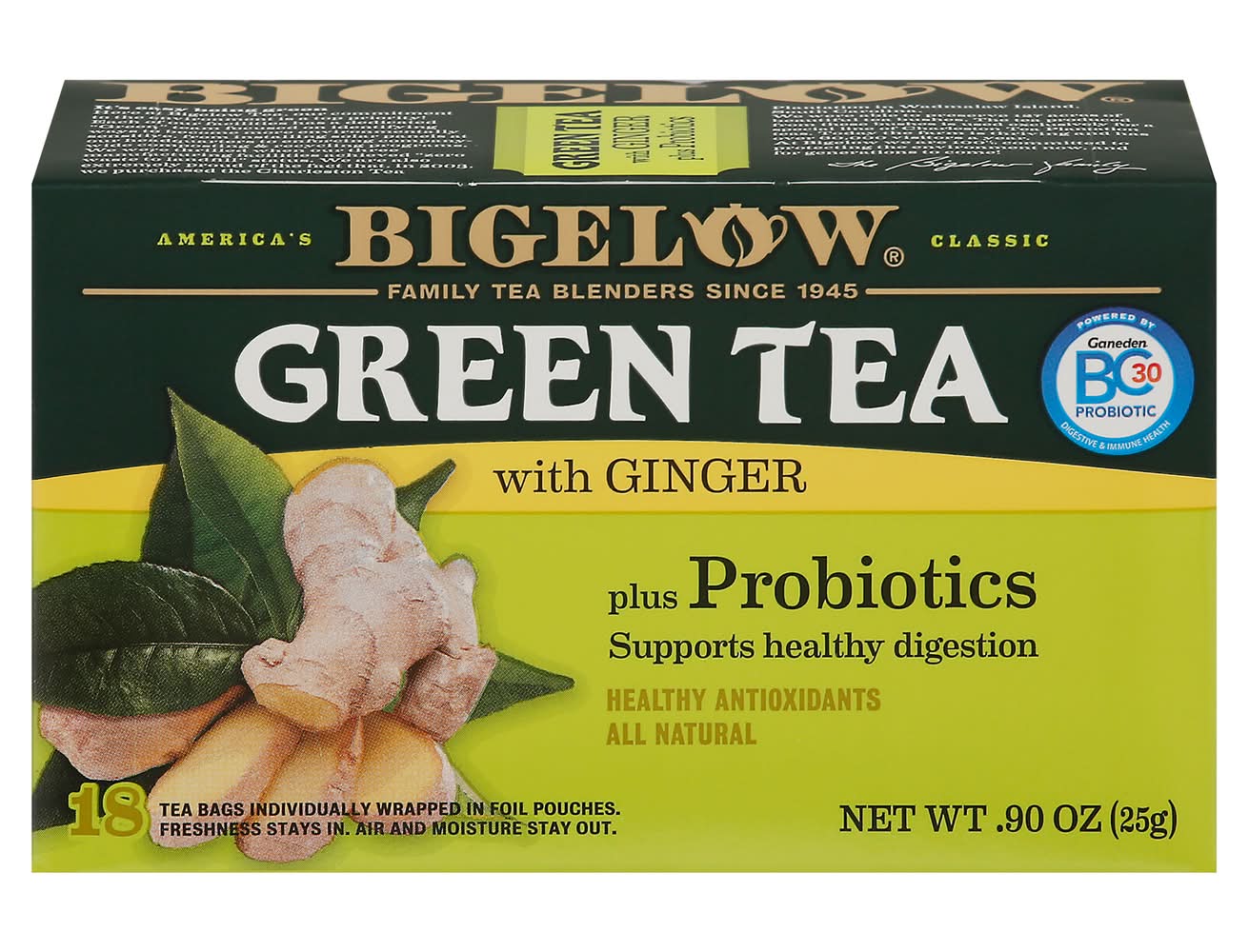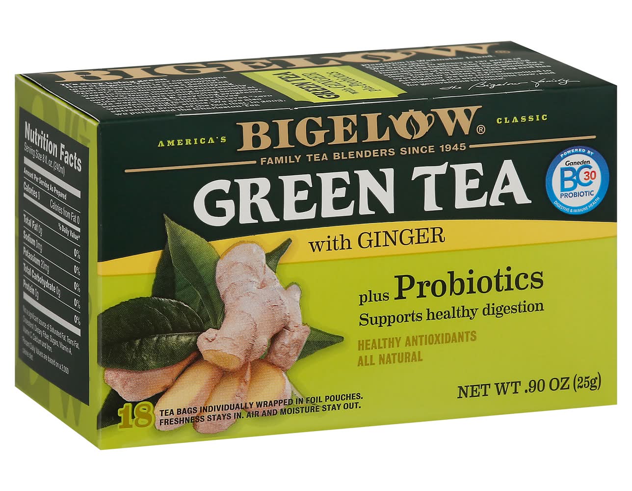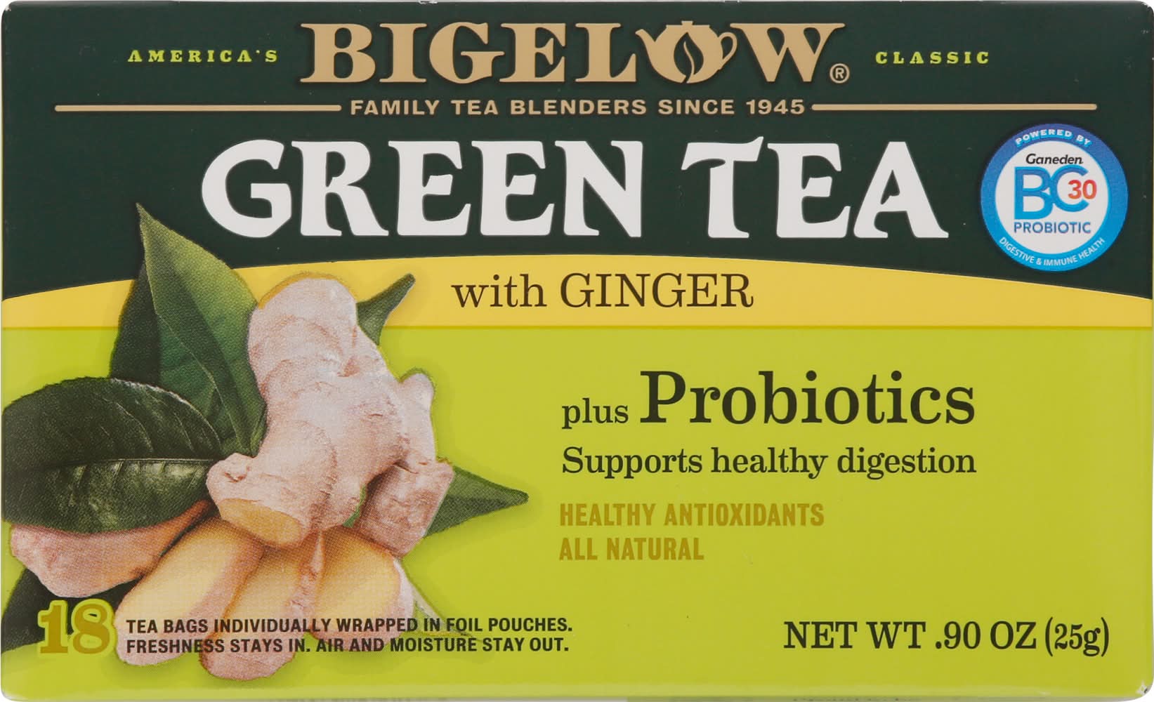 Tea bags individually wrapped in foil pouches. Family tea blenders since 1945. BC30 probiotics. Plus probiotics. Supports healthy digestion. Freshness stays in. Air and moisture stay out. Our time honored tradition of tea blending delivers a superior flavor that is smooth and delicate without any bitterness. Our family's recipe combines hand-picked tea leaves, harvested at their peak, with years of expertise and craftmanship. Quality ingredients and unprecedented skill takes our green tea to a level beyond compare - one sip, and you will taste the difference. Flavor: Ginger