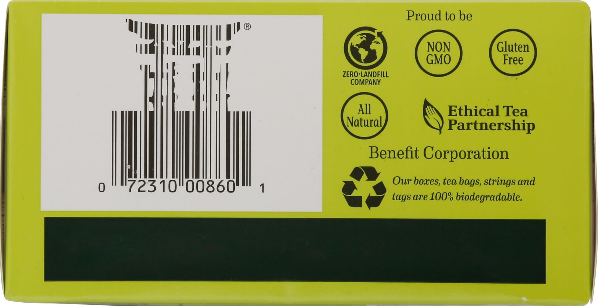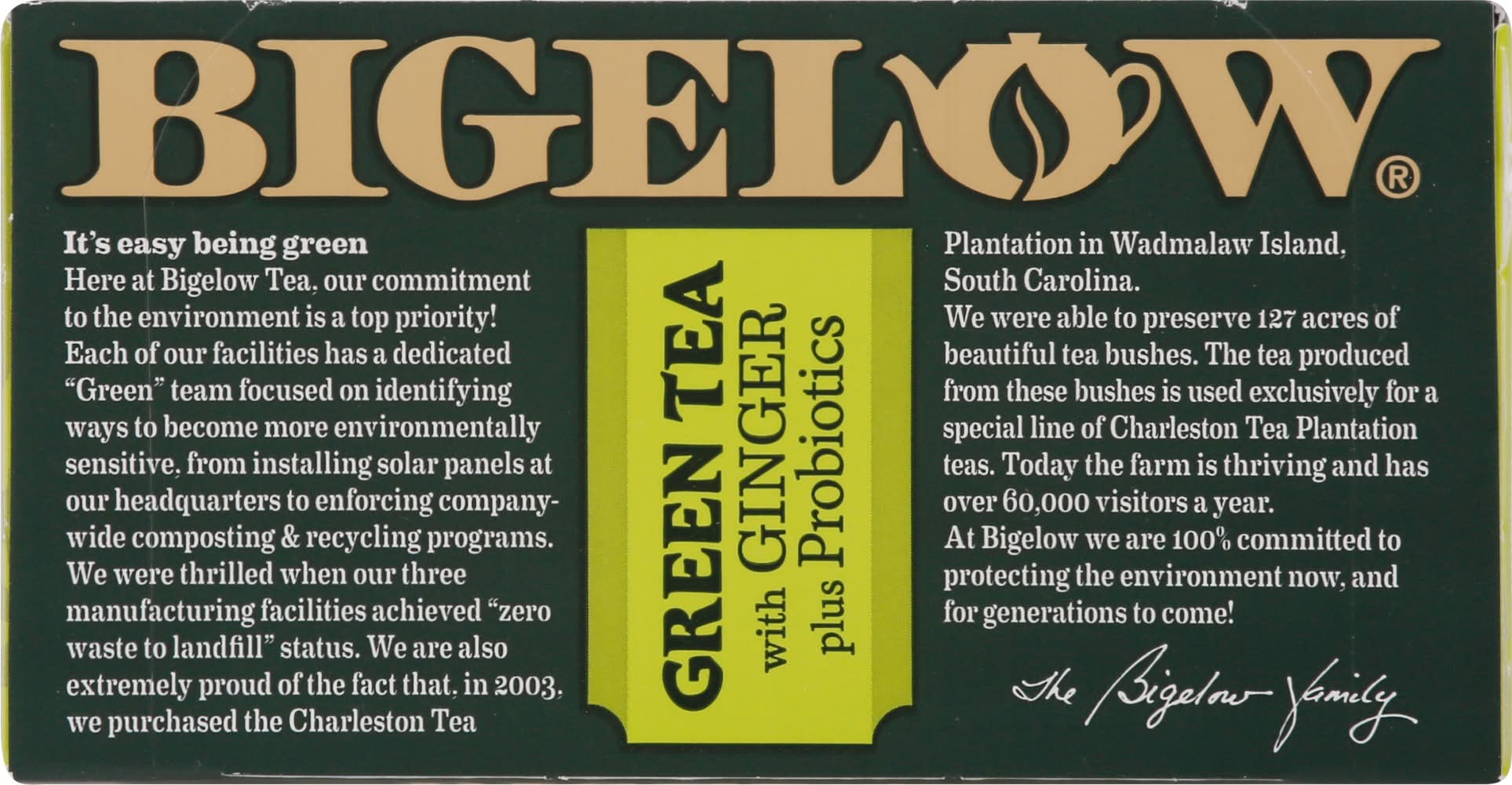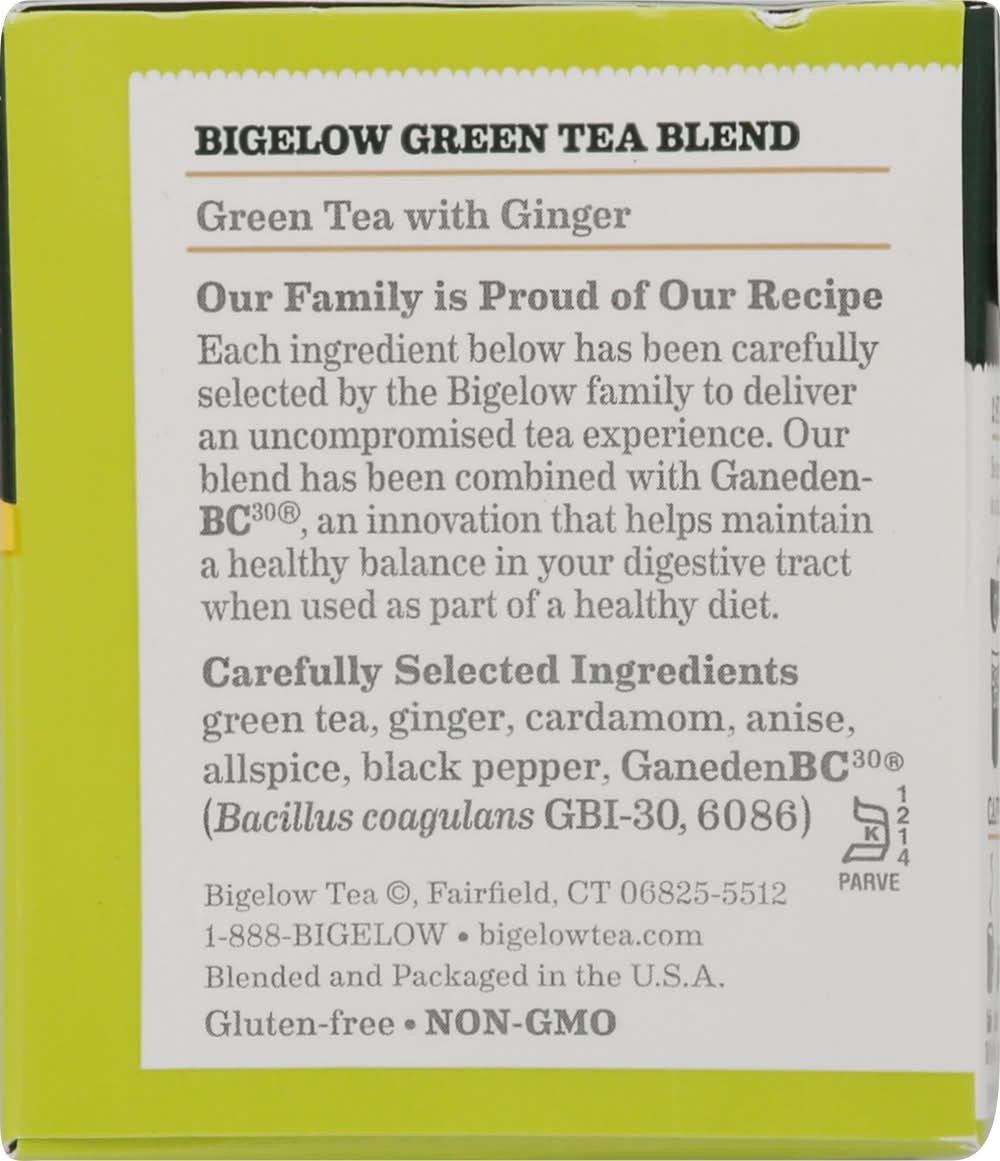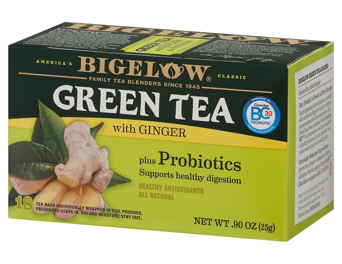Tea bags individually wrapped in foil pouches. Family tea blenders since 1945. BC30 probiotics. Plus probiotics. Supports healthy digestion. Freshness stays in. Air and moisture stay out. Our time honored tradition of tea blending delivers a superior flavor that is smooth and delicate without any bitterness. Our family's recipe combines hand-picked tea leaves, harvested at their peak, with years of expertise and craftmanship. Quality ingredients and unprecedented skill takes our green tea to a level beyond compare - one sip, and you will taste the difference. Flavor: Ginger